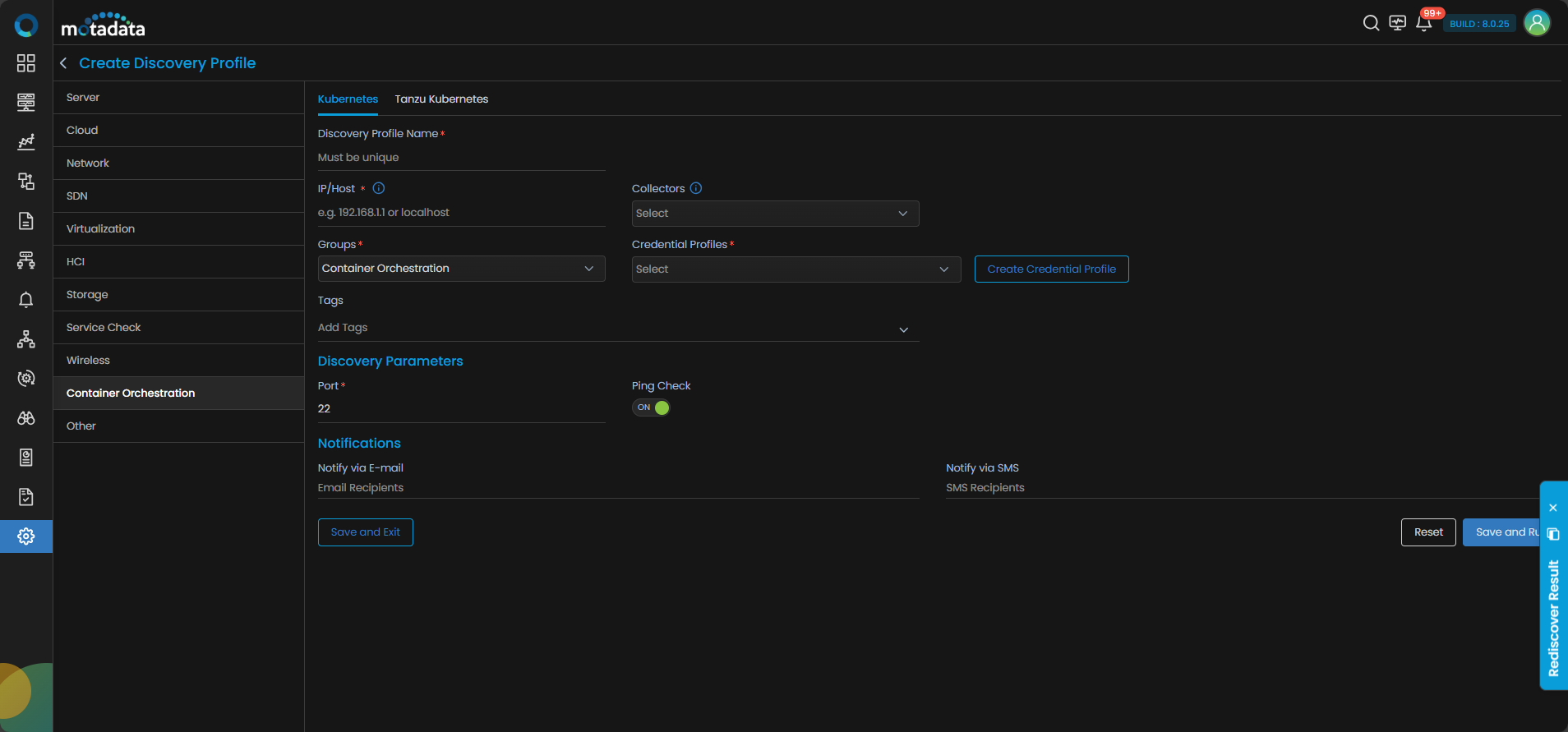and select Discovery Profile. The discovery profile screen is displayed. Select Create Discovery Profile to create a new discovery profile. Select Container Orchestration and click on the Kubernetes tab.