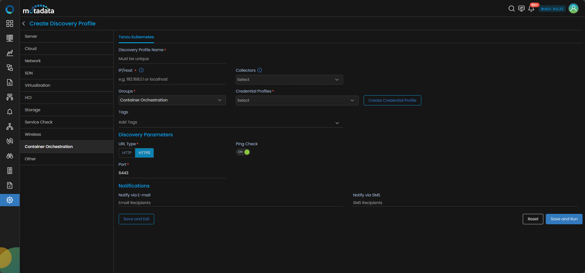 and select Discovery Profile. The discovery profile screen is displayed. Select Create Discovery Profile to create a new discovery profile. Select Container Orchestration and click on the Tanzu Kubernetes tab.