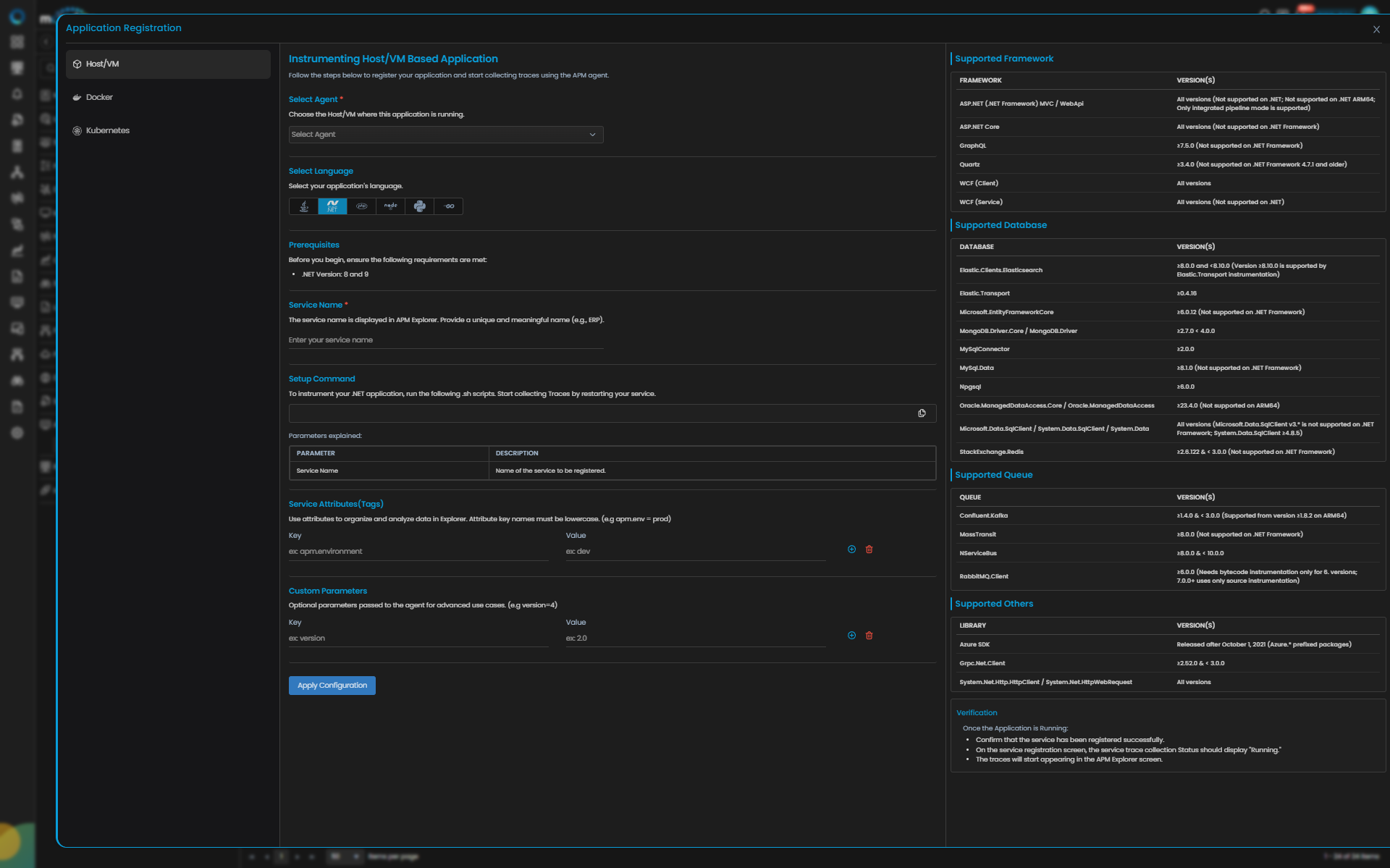 Go to Menu > Settings > APM > Application Registration. Clicking the Application Registration button, you can register a new application.