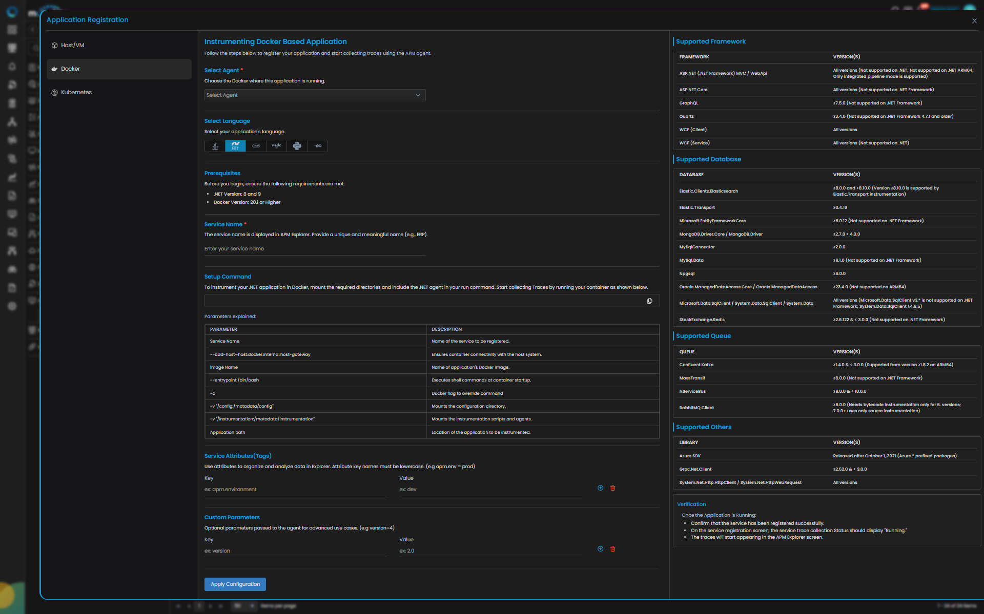 From the application registration screen, select the instrumentation type Host/VM or Docker.
