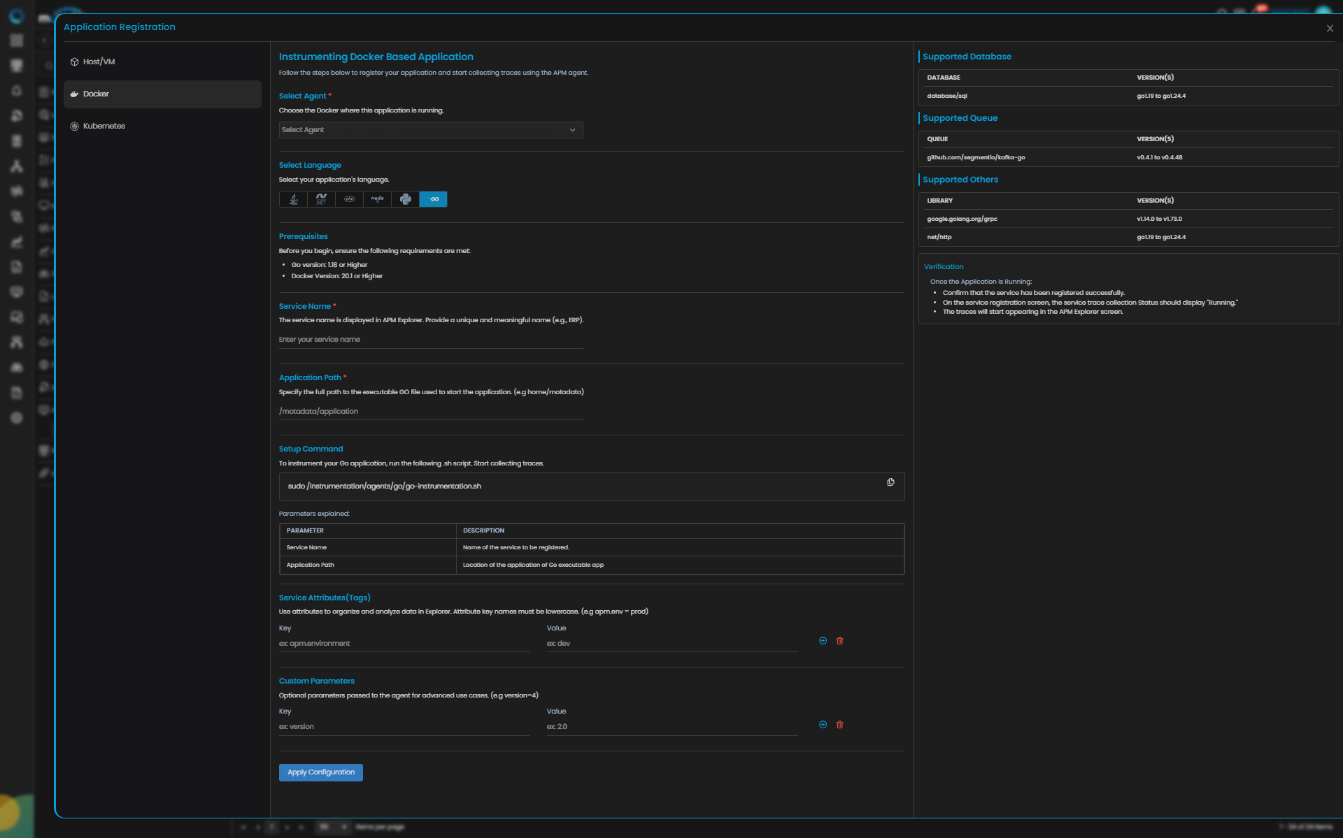 Providing these details displays the Setup Command to instrument your Go application in Docker.