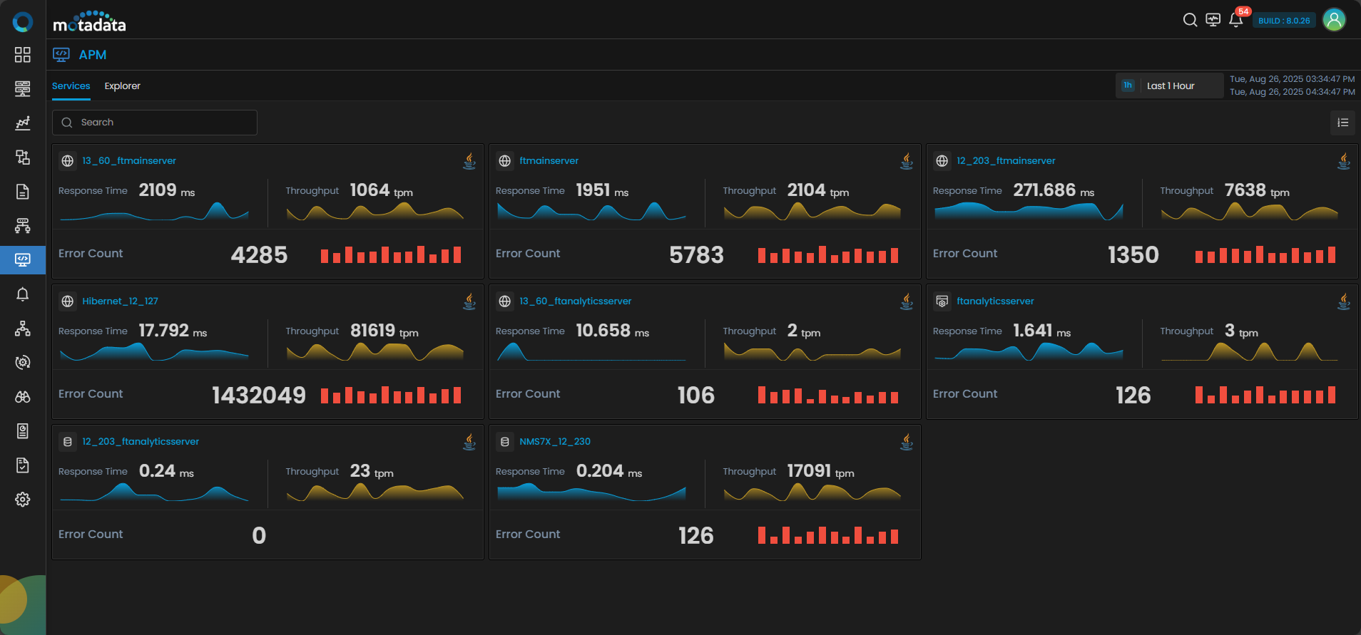 Go to the APM Explorer section from the main menu. Click on Service to view all registered services. Each service tile includes quick insights such as Response Time, Throughput, and Error Rate.