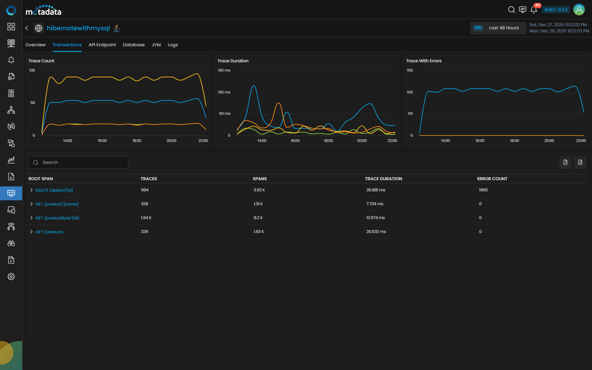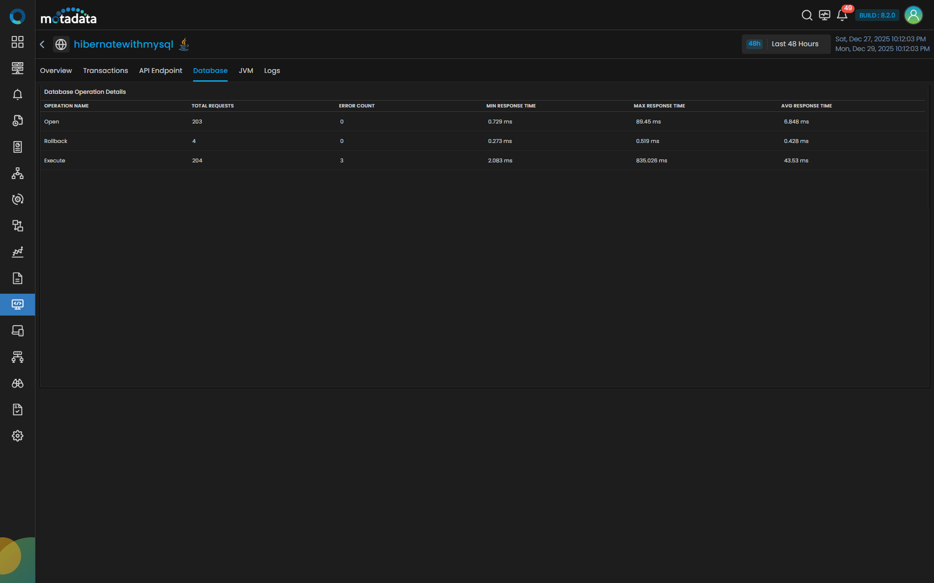 | Error Count | Shows the number of failed requests or exceptions encountered for that operation. A higher count may indicate database connectivity or query issues. |