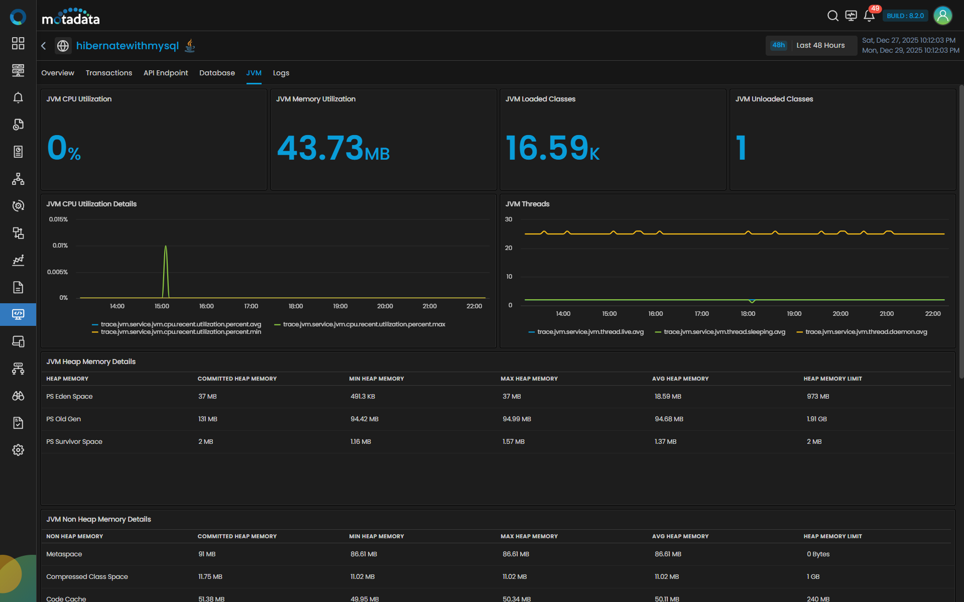 | JVM Heap Memory Details | Per region (Eden, Old Gen, Survivor): Committed, Min, Max, Avg, and Limit (MB) to gauge pressure and headroom. |