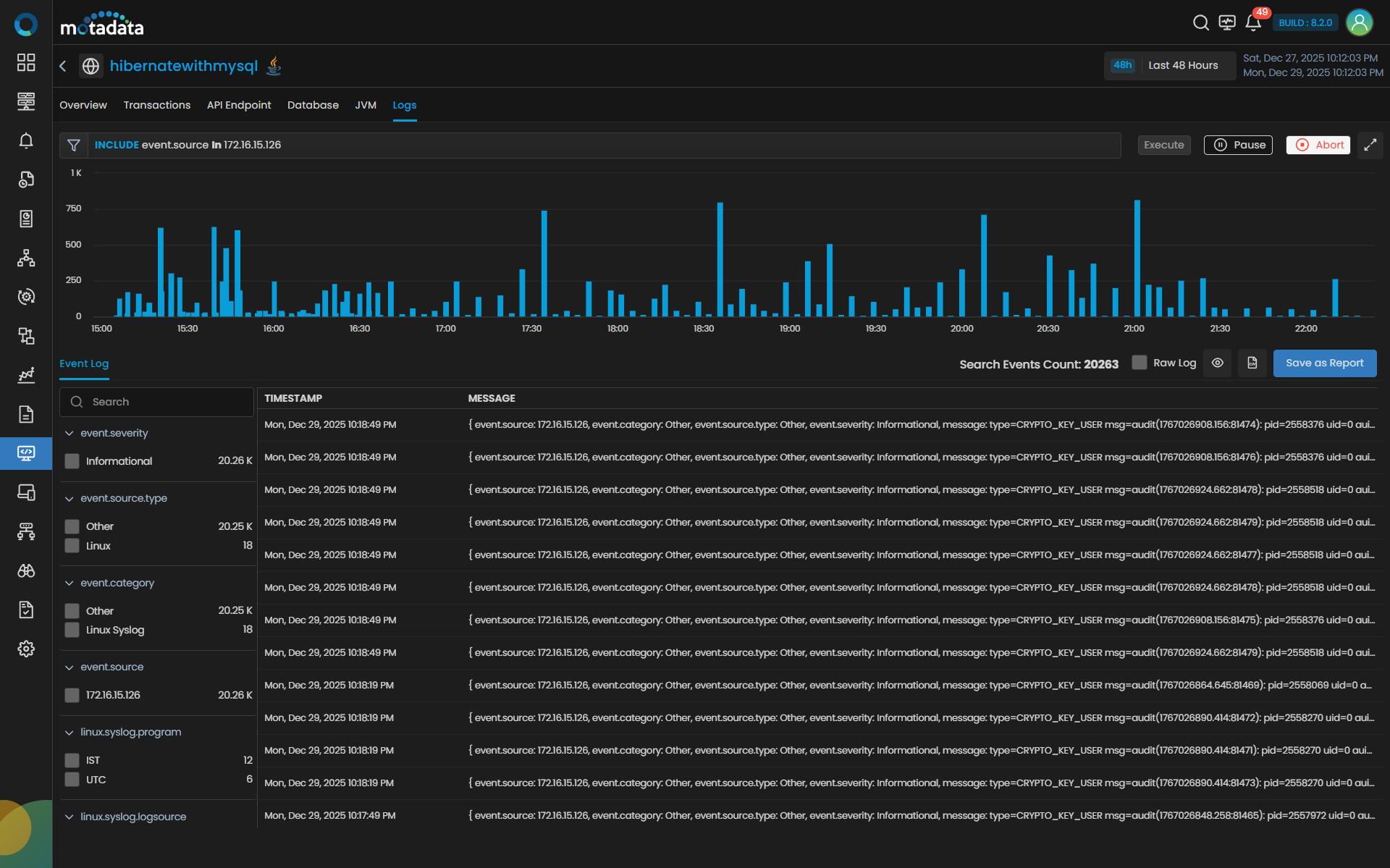 Correlation from Traces: When opened from Trace drilldown to Logs, this view is auto-filtered to the same service and ±15 minutes around the trace timestamp to provide immediate context.
