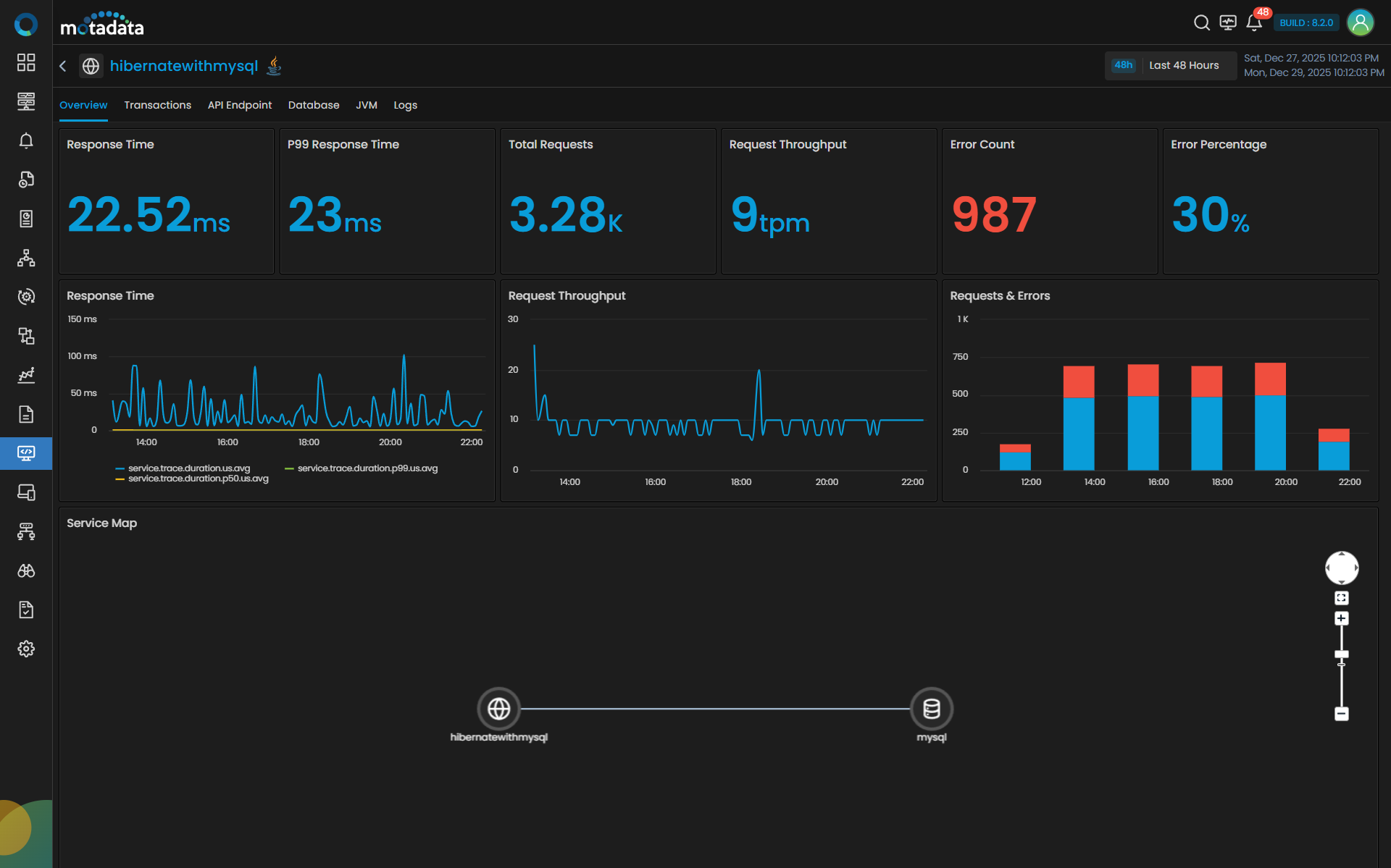 The Overview tab displays Service Map, Request & Errors, Latency and Error Count. Clicking the Transactions tab displays details like Trace Count, Trace Duration, Trace With Errors and a grid.