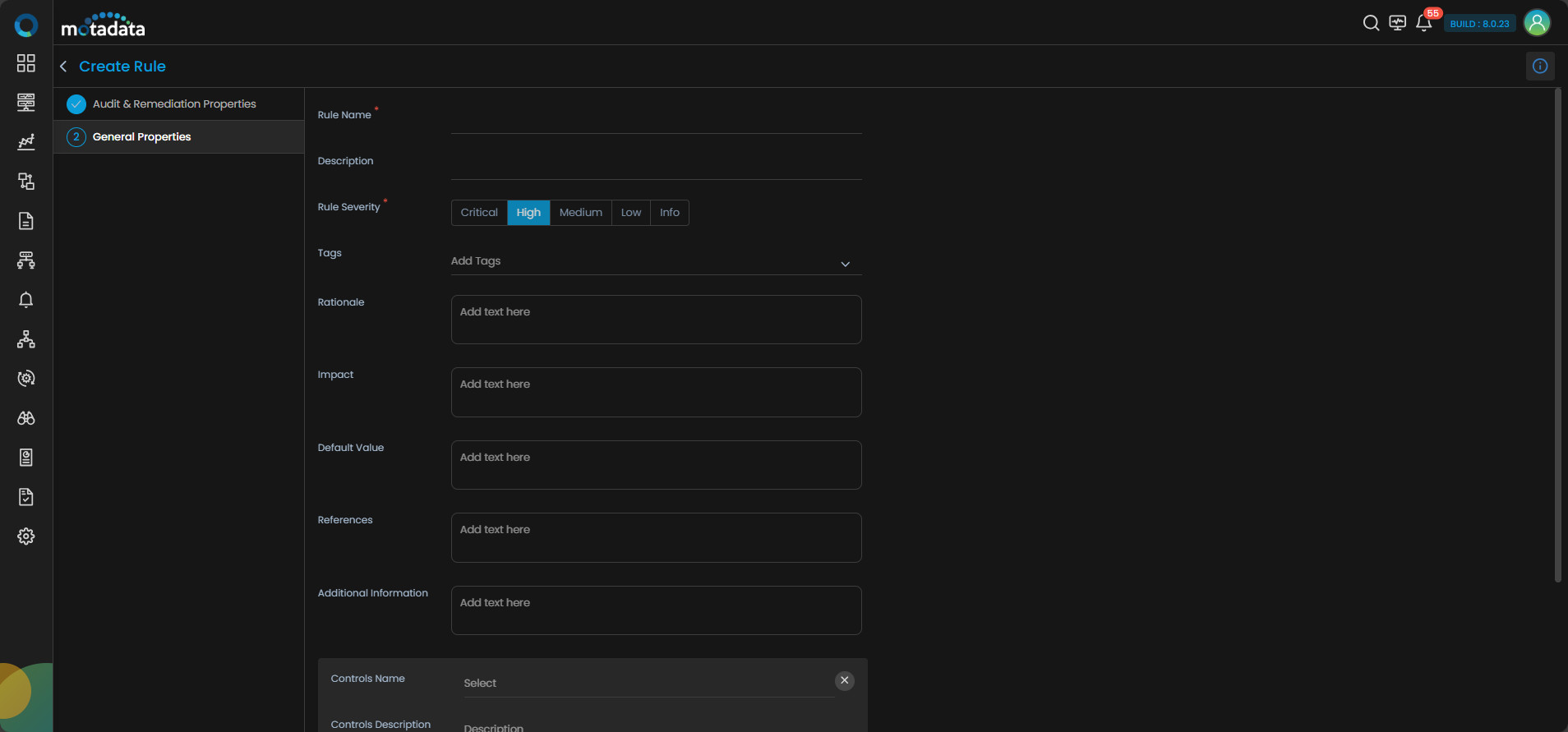 There are two steps to create a Rule, user will first need to configure the Audit & Remediation Properties and in the second step, user can define general properties such as, name, description, severity, impact, and other details. Let's look at creating a rule step-by step: