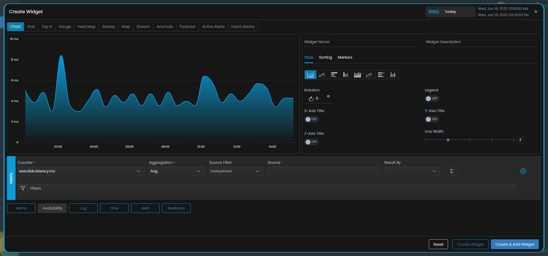 Let us move back to the example of a Chart widget that we discussed in the section about visualisation. We used Chart Widget to view the disk latency of all the ESXi monitors added in Motadata AIOps over a period of time.
