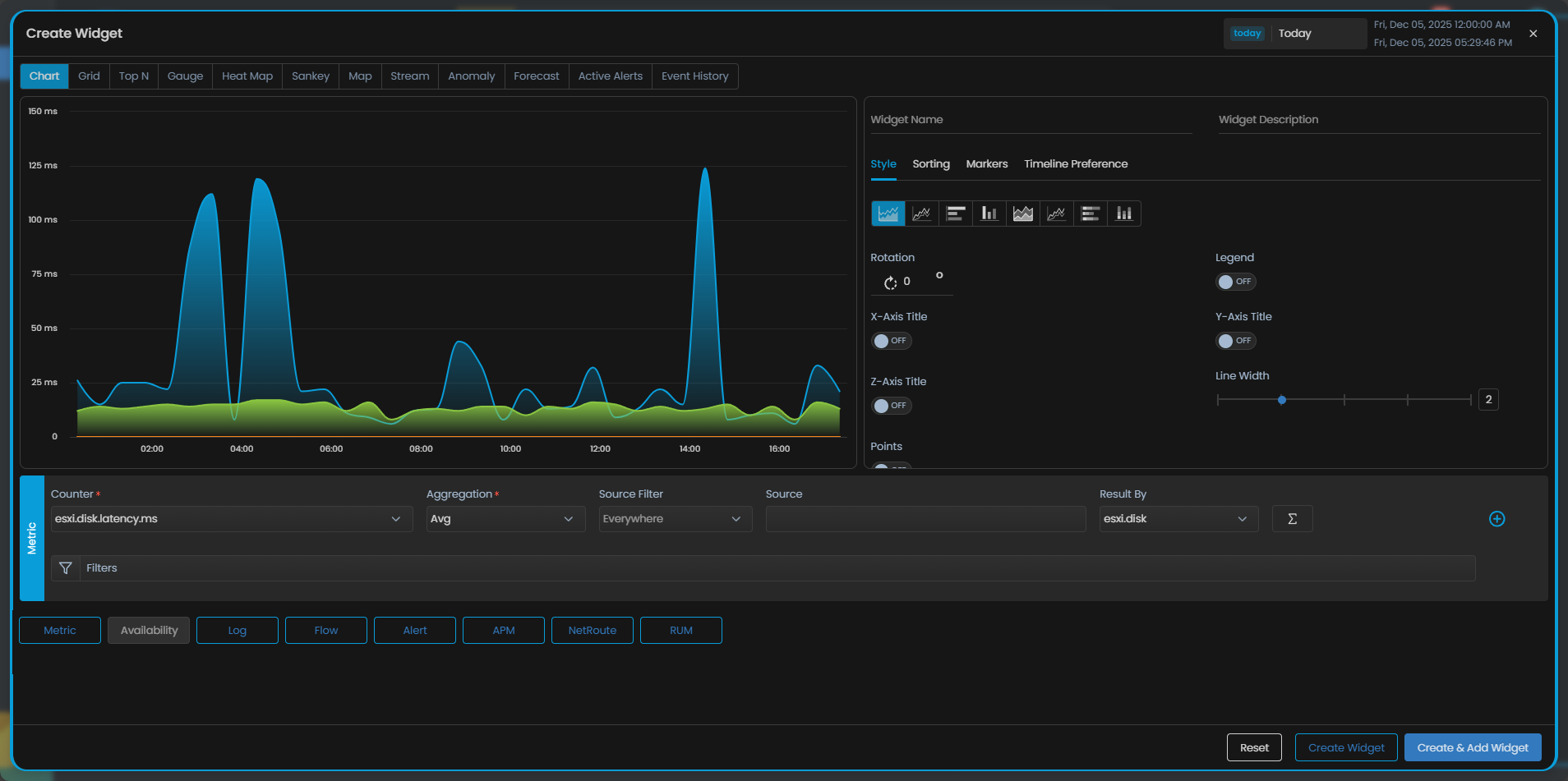 Suppose you want to create a widget to view the disk latency over a period of time of all the ESXi monitors that you have added to the system, you can do so by creating a Chart Widget.