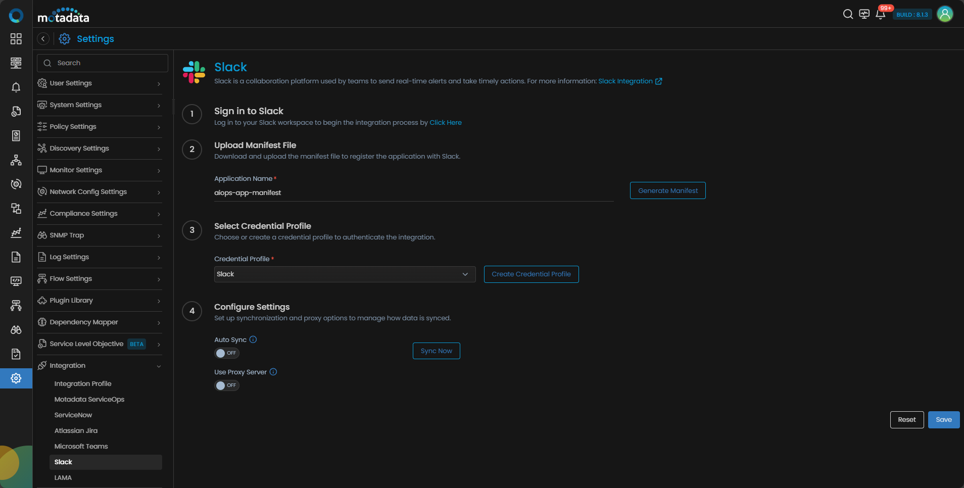 | Auto Sync | Sync Slack metadata, including workspace, channels and more with your Motadata AIOps Integration profile. |