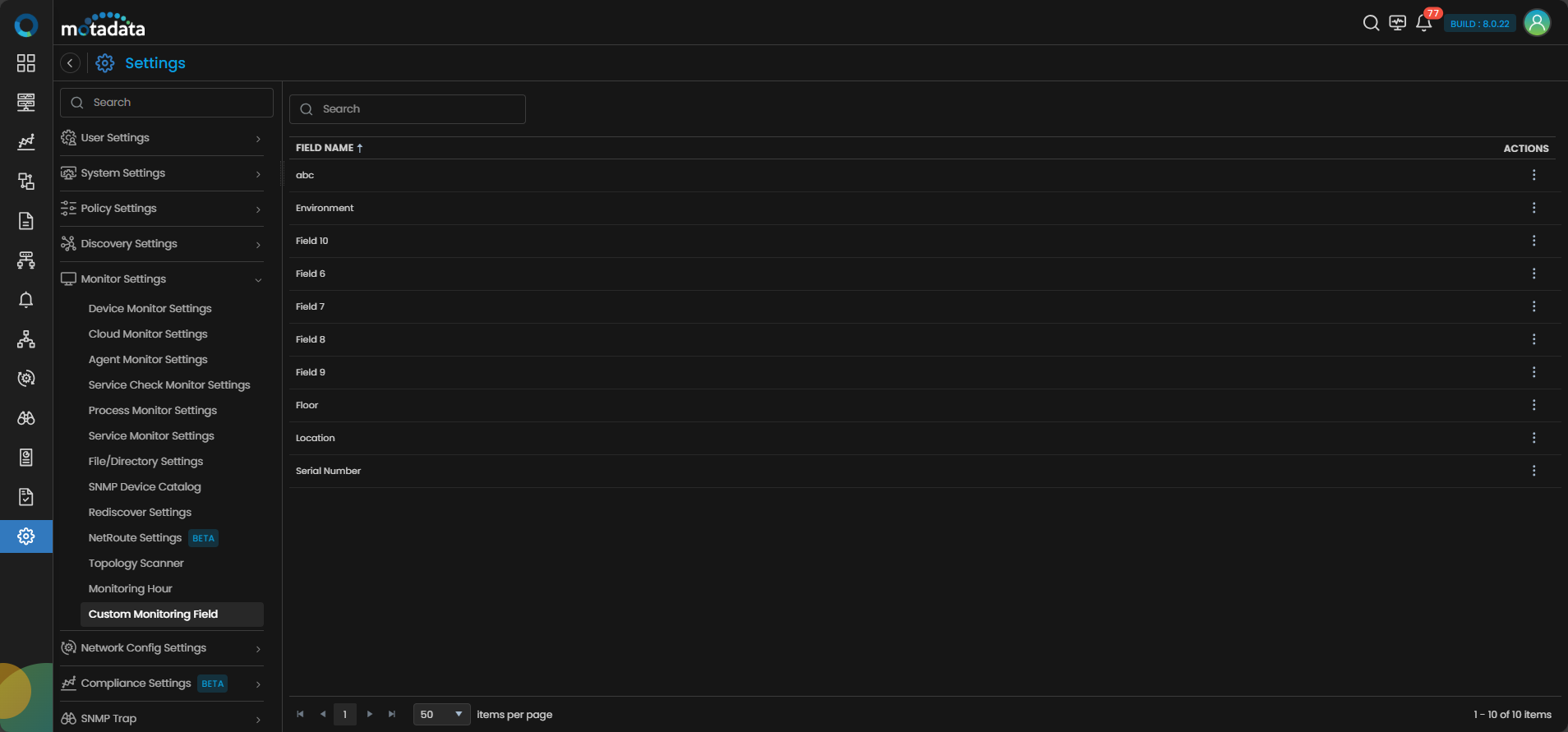 For example, if you have multiple monitors located at a particular location, you can add a custom field at the monitor level to mention the location of monitors. By creating a custom field with a fixed value, you can assign the field to all the monitors discovered from that particular location. The field will then be available to view against these monitors on the Monitor Screen, as well as the Device/Agent/Cloud/Service Monitor Settings Screen.