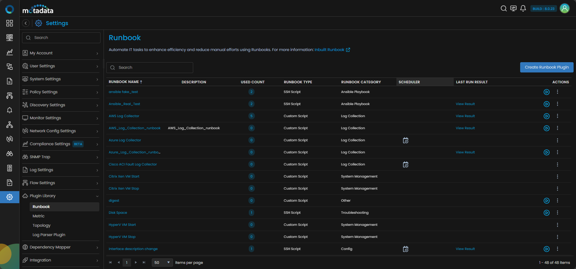 Here you can view the list of all the inbuilt runbooks in Motadata AIOps. You can also view the list of custom runbooks you have created, if any.