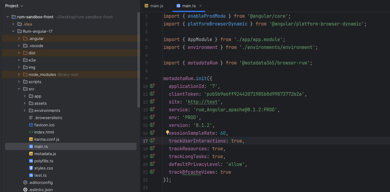 Open your AngularJS application’s main.js file and add the RUM initialization code snippet after completion of import library commands.