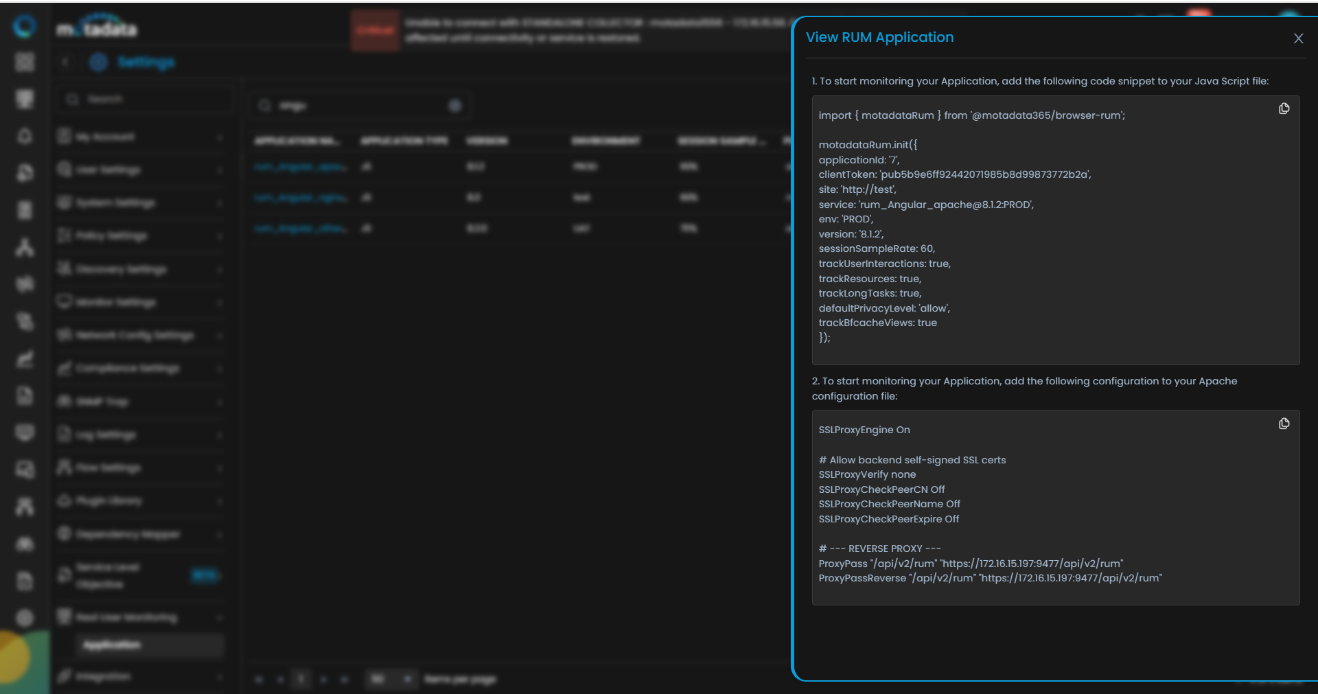 This guide explains how to instrument an Angular application for Real User Monitoring (RUM) and route browser RUM data through Apache to the Motadata backend.