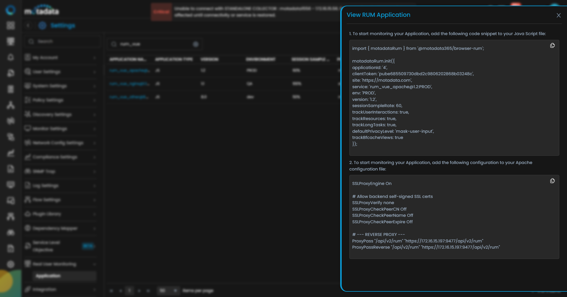 - Apache forwards the RUM payloads to Motadata using a reverse proxy route (