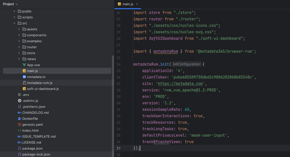 Open your Vue application’s main.js file and add the RUM initialization code snippet after completion of import library commands.