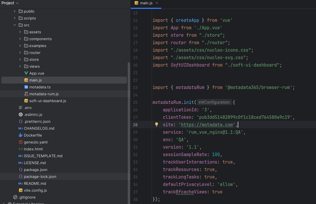 Open your Vue application’s main.js file and add the RUM initialization code snippet after completion of import library commands.
