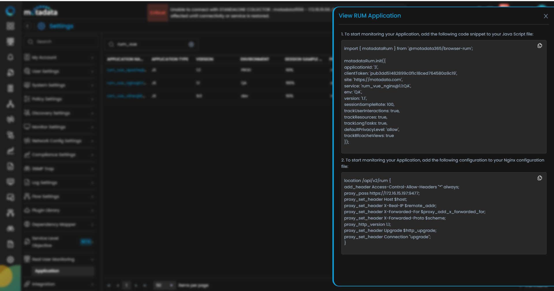 - Nginx forwards the RUM payloads to Motadata using a reverse proxy route (