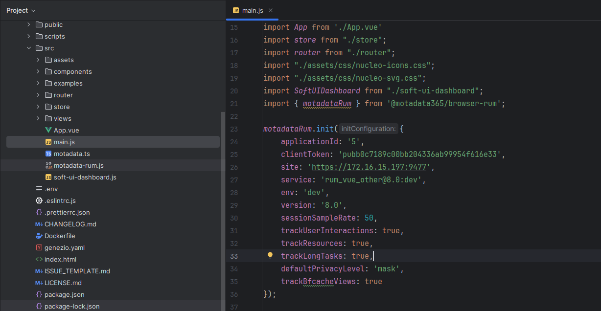 Open your Vue application’s main.js file and add the RUM initialization code snippet after completion of import library commands.