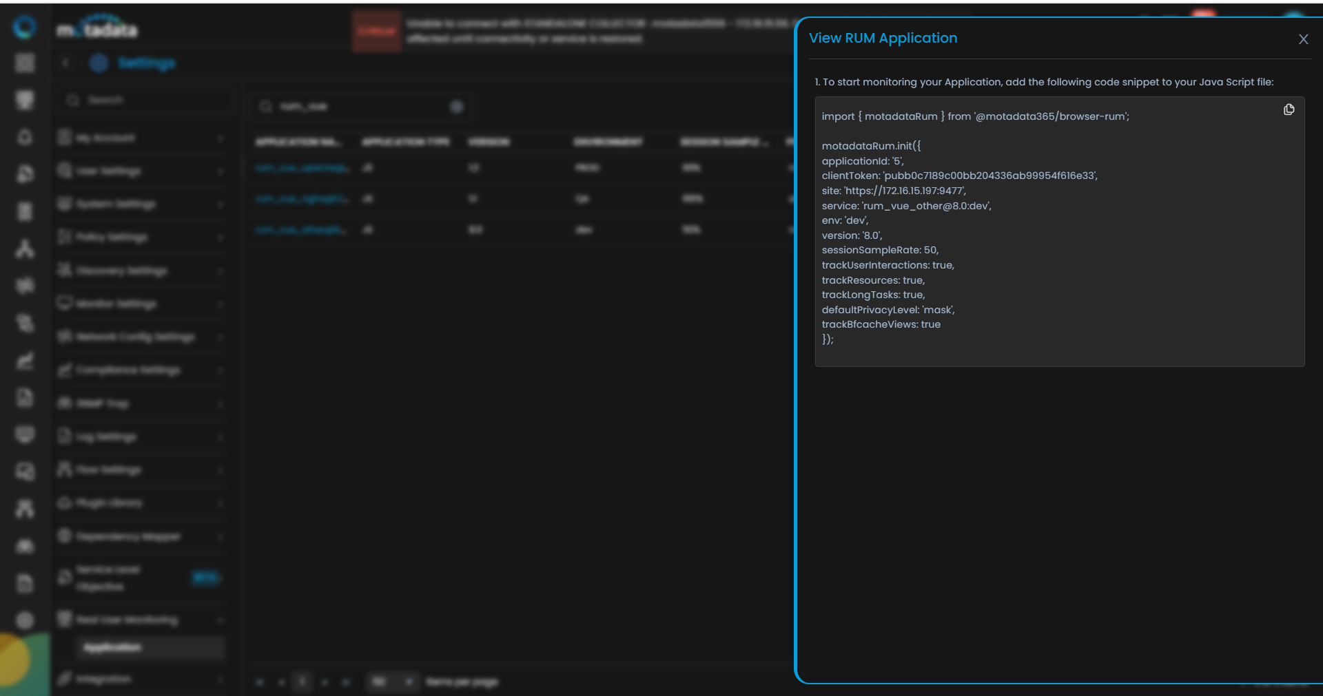 - The Vue.js application captures user experience data using the Motadata RUM SDK.