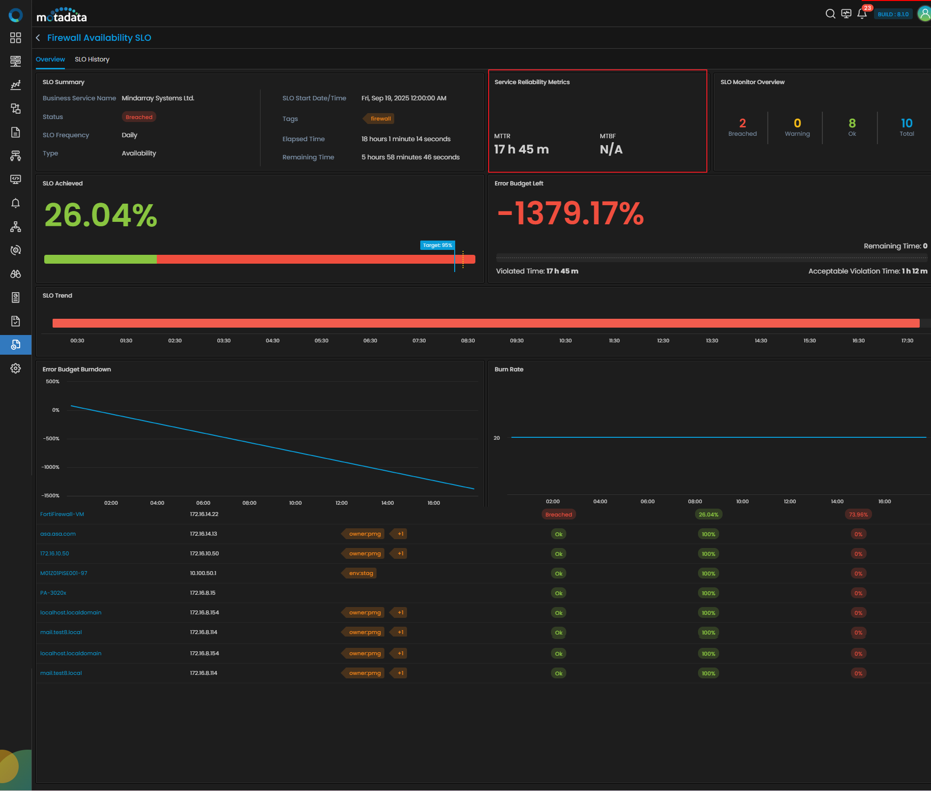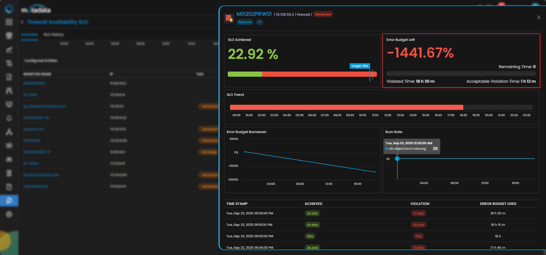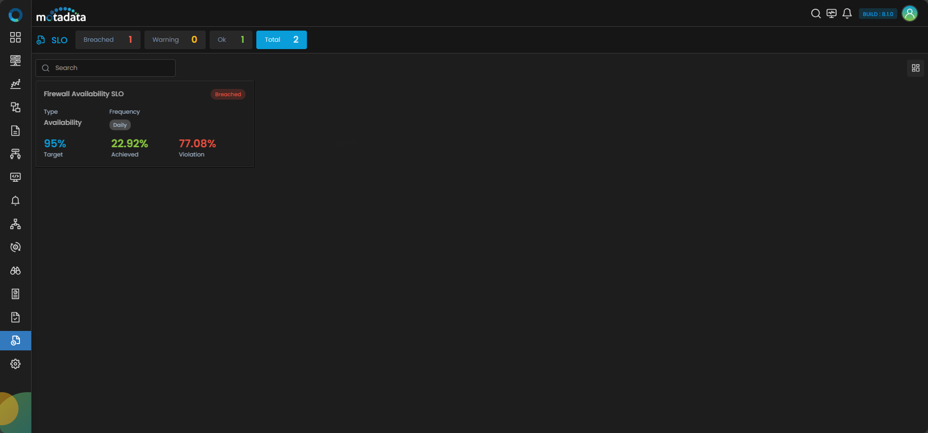 This document provides an in-depth explanation of the core metrics used in Service Level Objectives (SLOs) within Motadata AIOps. These metrics are critical for understanding service health, performance violations, and maintaining reliability against expected thresholds.