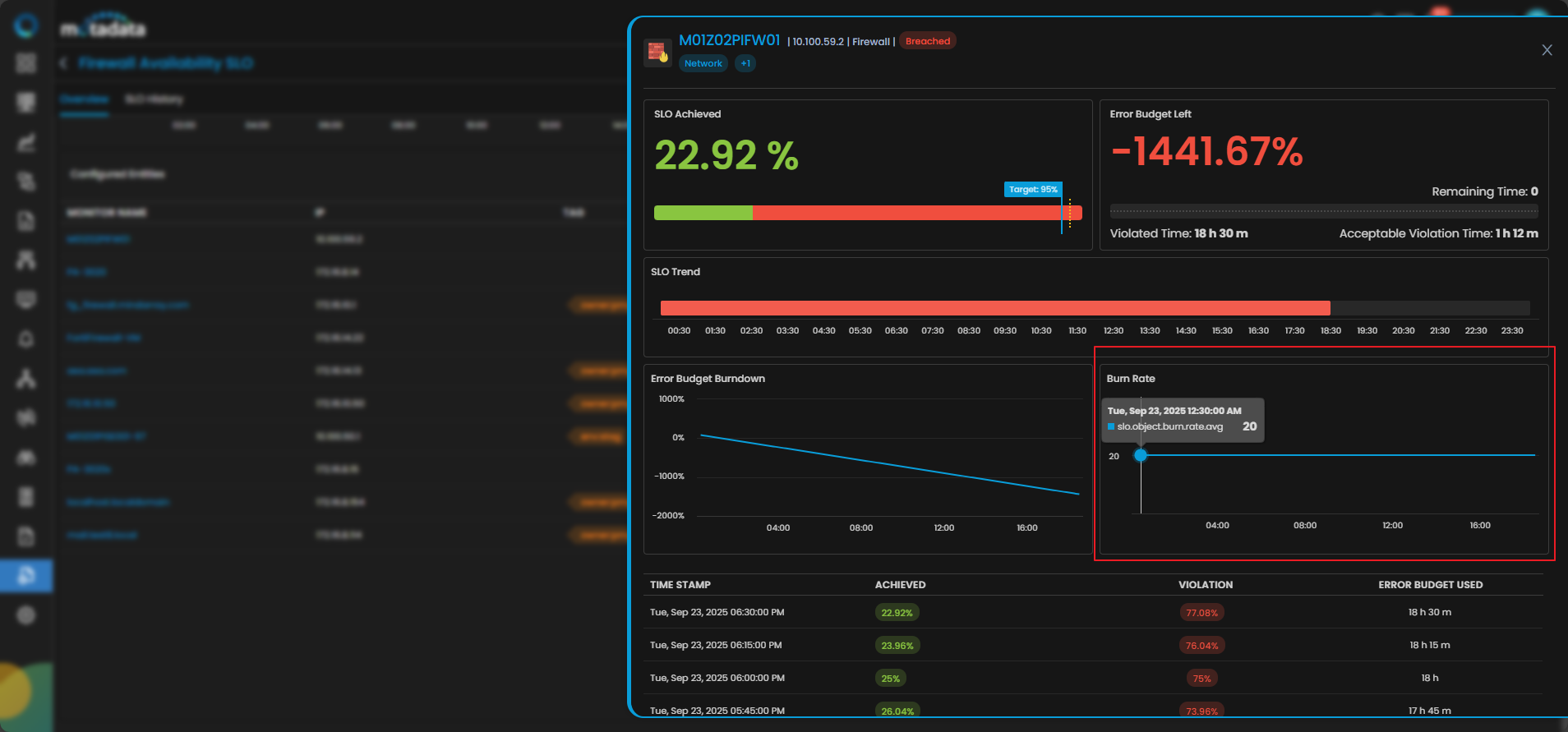 Also, you can observe the configured monitors' grid with details at the bottom of the screen. That displays only the monitor M01Z02PIFW01 caused the SLO breach.