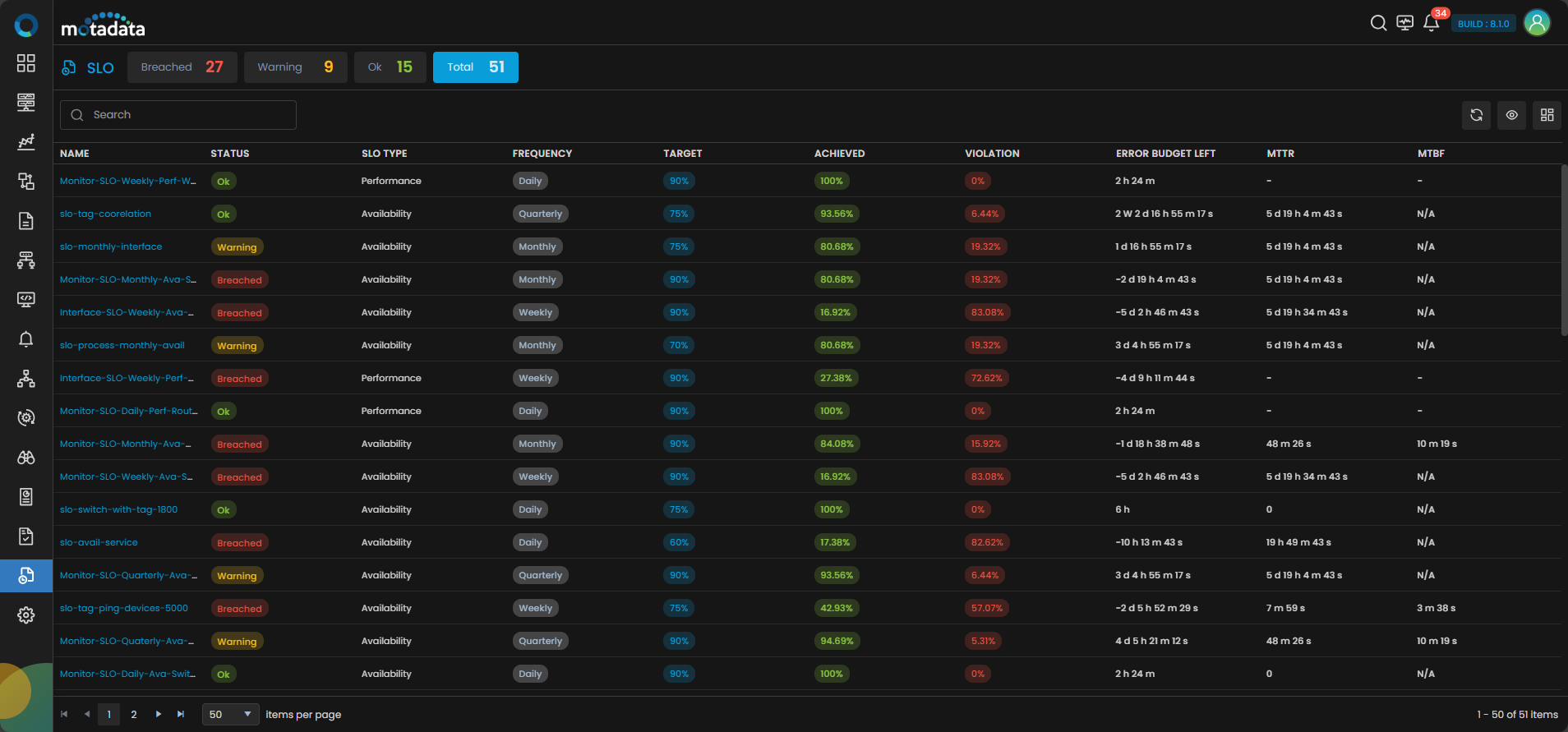 You can filter SLOs by status using the buttons (Breached, Warning, Ok or Total) above the grid or customize visible columns using the eye icon.