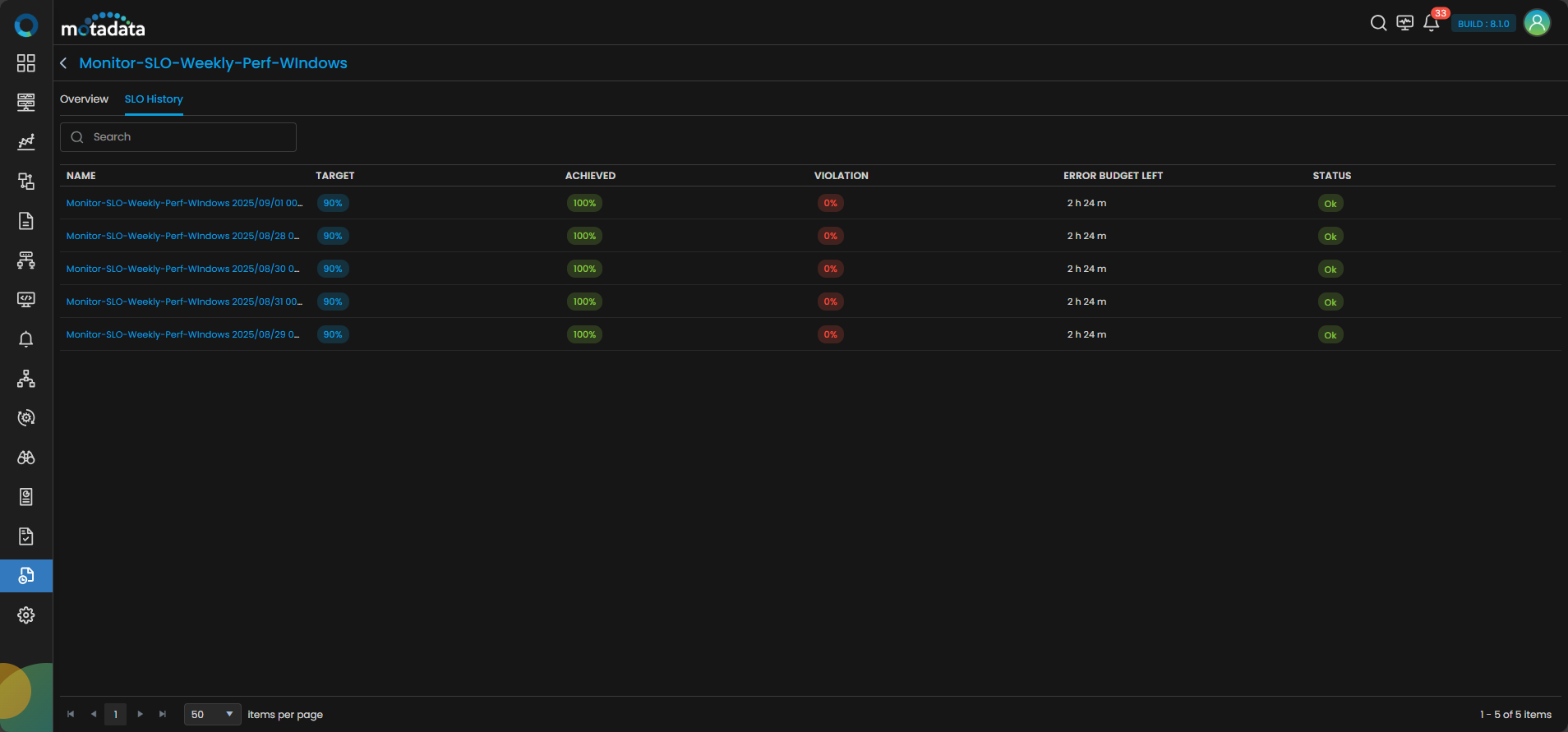 Clicking on any SLO card or name from the grid, it opens a detailed screen with two tabs: Overview and SLO History.