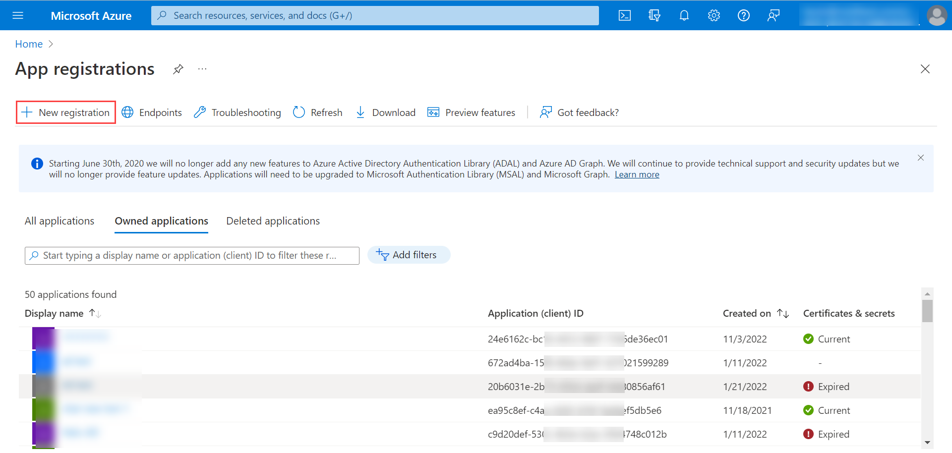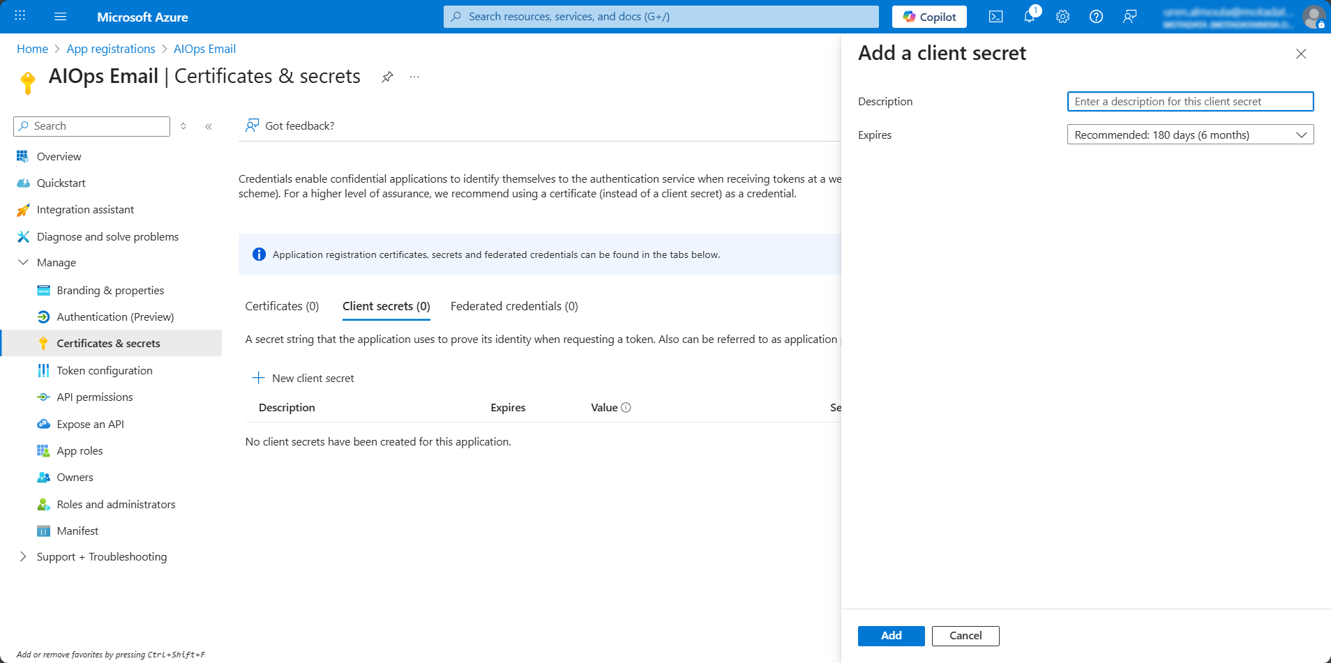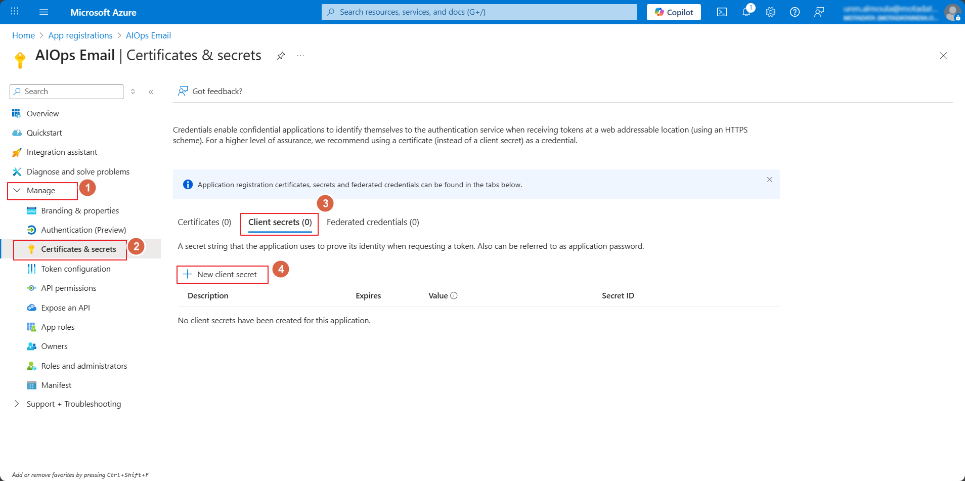 - Go to the Manage > Certificates & secrets > Client secrets tab, and click New Client Secret.