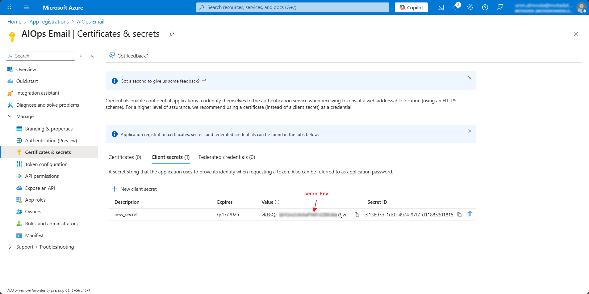noteThe client secret value can be viewed only once immediately after creation. Hence, it is recommended to save the secret key before leaving the page.