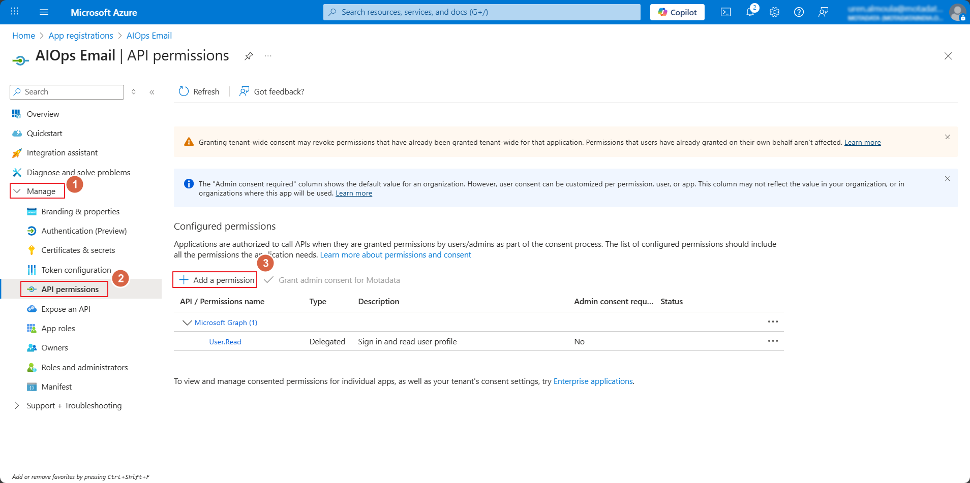 - In Microsoft Azure, go to Manage > API Permissions tab, and click Add a permission to add permissions for the application.