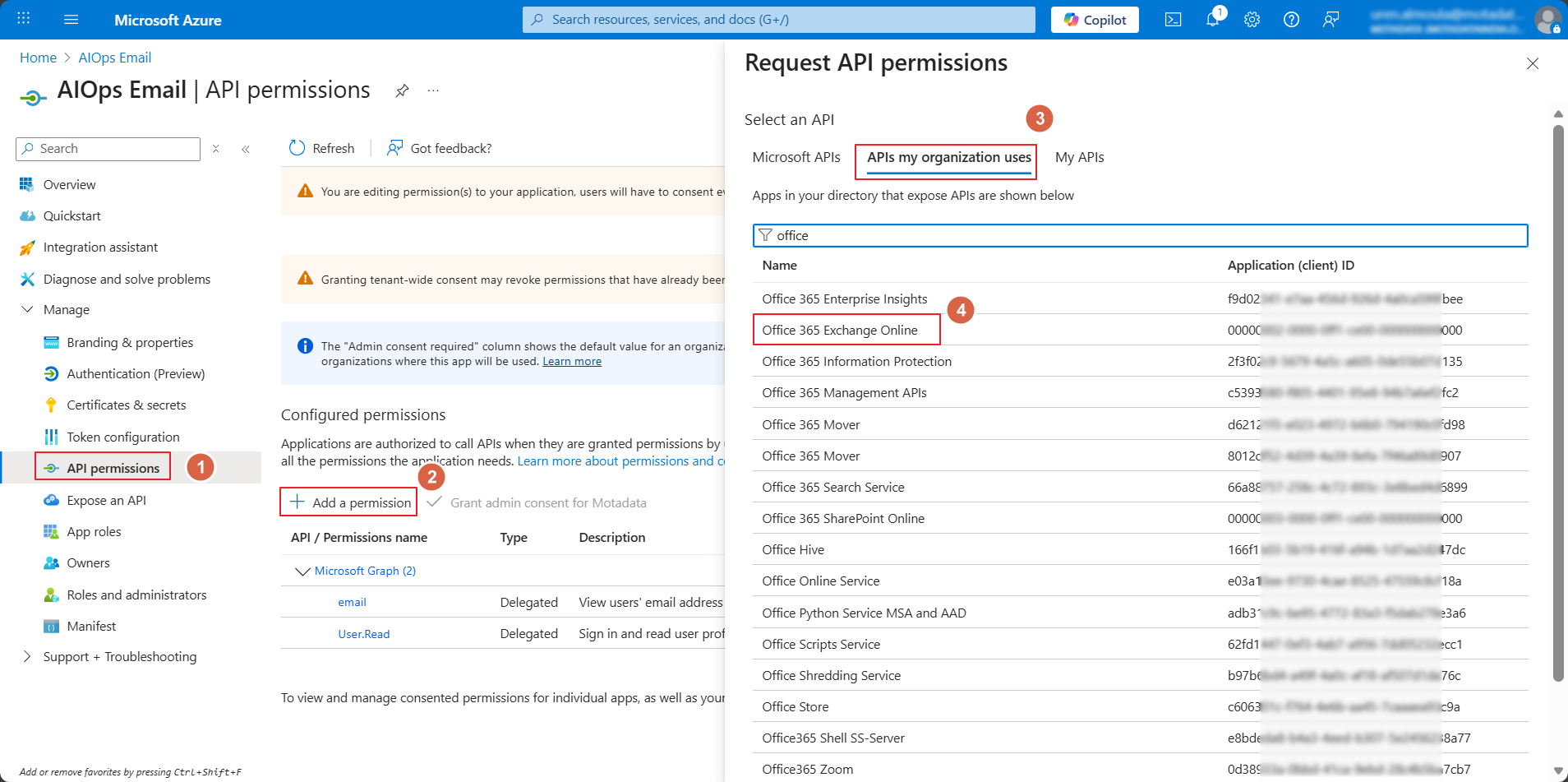 - Add Permissions for IMAP or Office 365 Exchange Online (MAPI).
