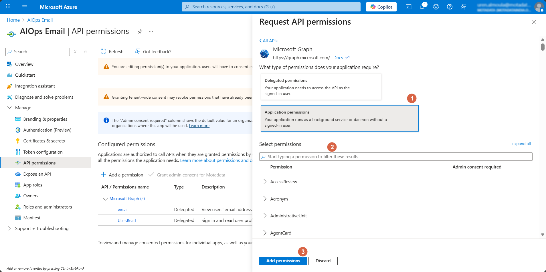 - Next, click on the Application permissions tab, select the desired permissions, and click Add Permissions.