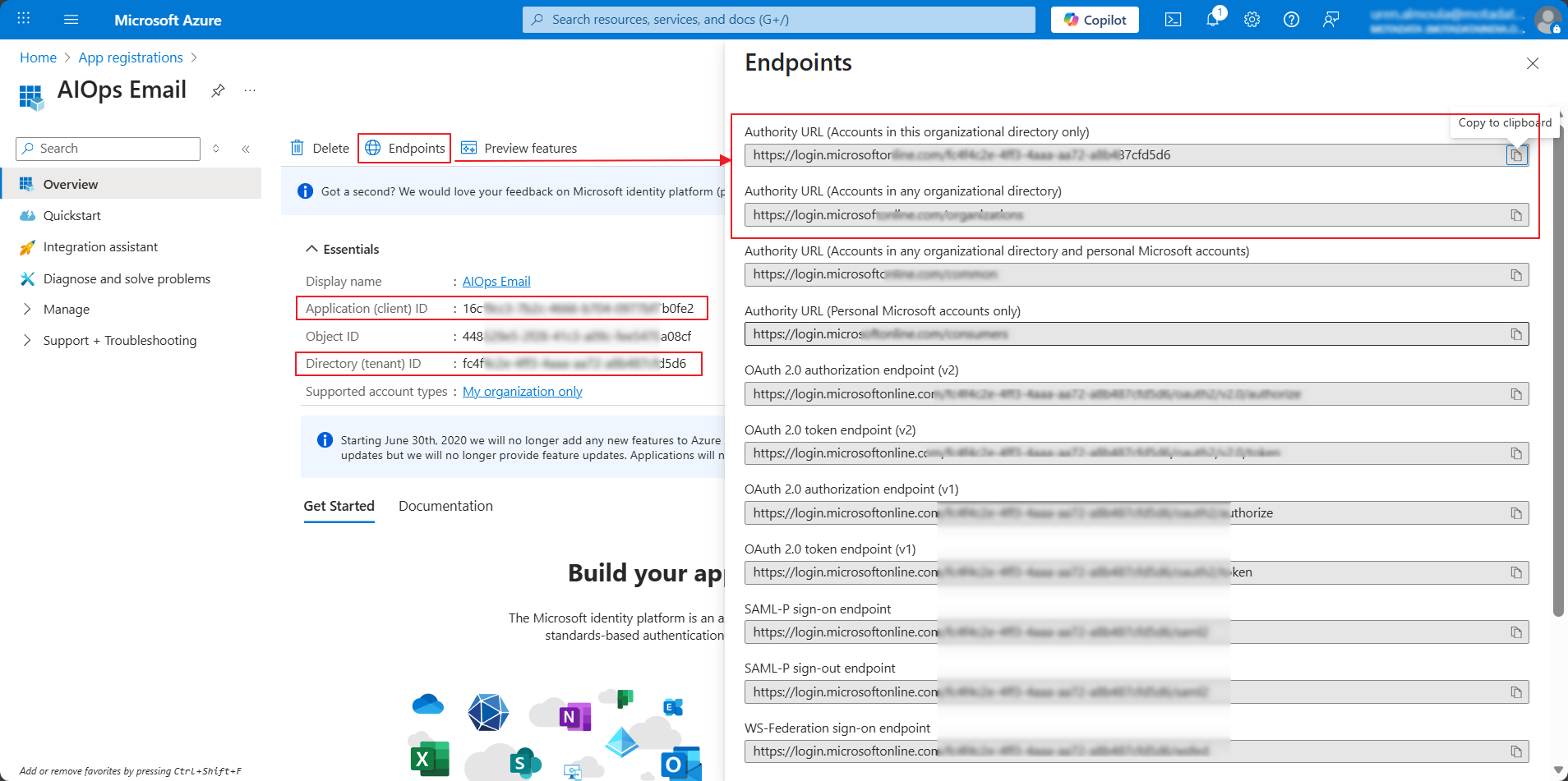 - Click on the application, and the below screen appears. Copy the Application (client) ID and paste it in AIOps. For Authorization and Token URL either click the Endpoints tab and copy OAuth 2.0 authorization endpoint (v2) and OAuth 2.0 token endpoint (v2) URLs from the popup or copy the Tenant ID from Overview and use it for both the URLs in AIOps.