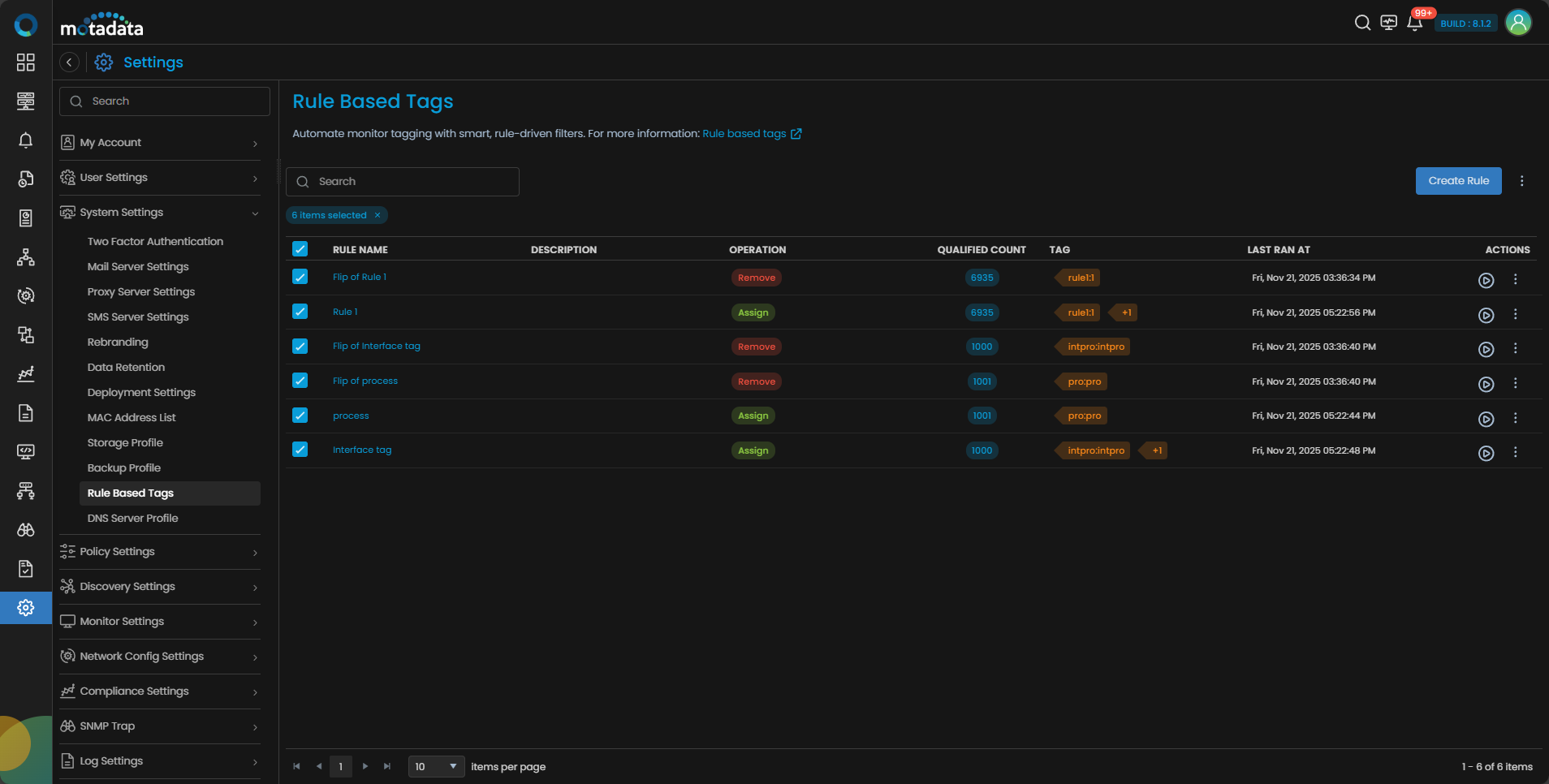 Motadata AIOps introduces rule-based tagging, a feature designed to automate the assignment and removal of tags across various monitored entities, including Monitors, VMs, Applications, Processes, Services, IP SLA, and Interfaces. This functionality eliminates the manual effort traditionally required for tag management.
