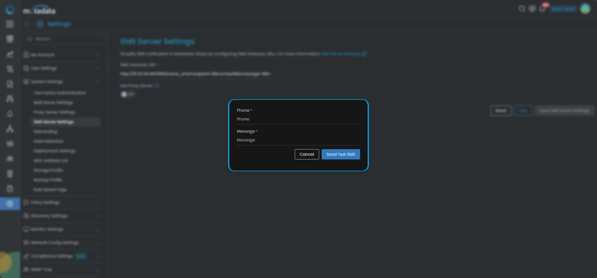 Provide the details for the recepient number and message in the pop-up and click on the Send Test SMS button. Once the Test SMS is sent successfully, you can then click on the Save SMS Server Settings button to save the SMS server settings you just configured.