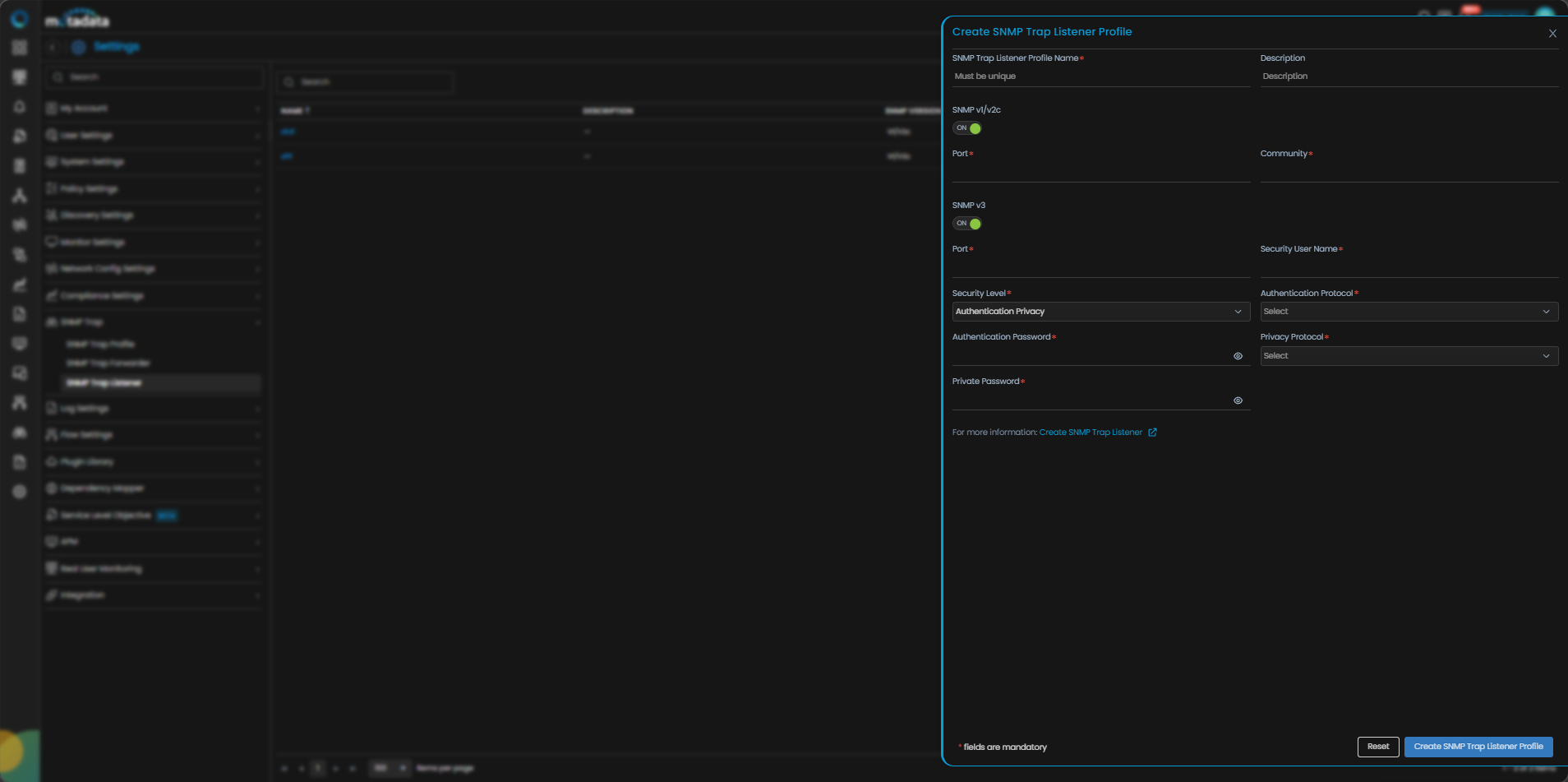 Once the listener is configured, click the Create SNMP Trap Listener Profile button to start listening for SNMP traps and ingest them in Motadata AIOps. You can click the Reset button to reset the details if required.