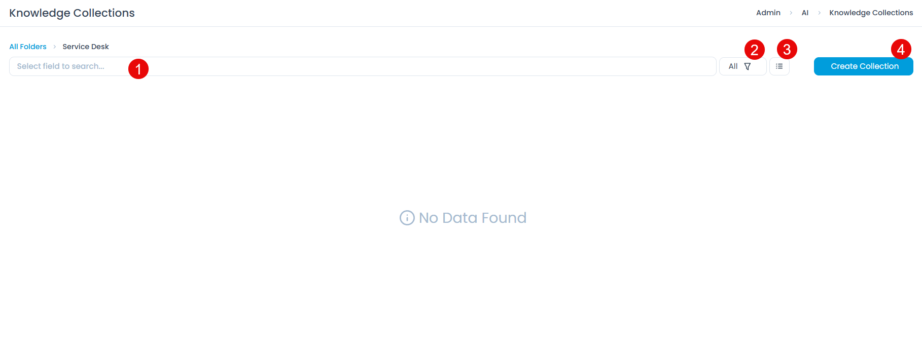 Navigate to Admin > AI > Knowledge Collections and click the folder in which you want to create the collection. The folder's collection list page appears.