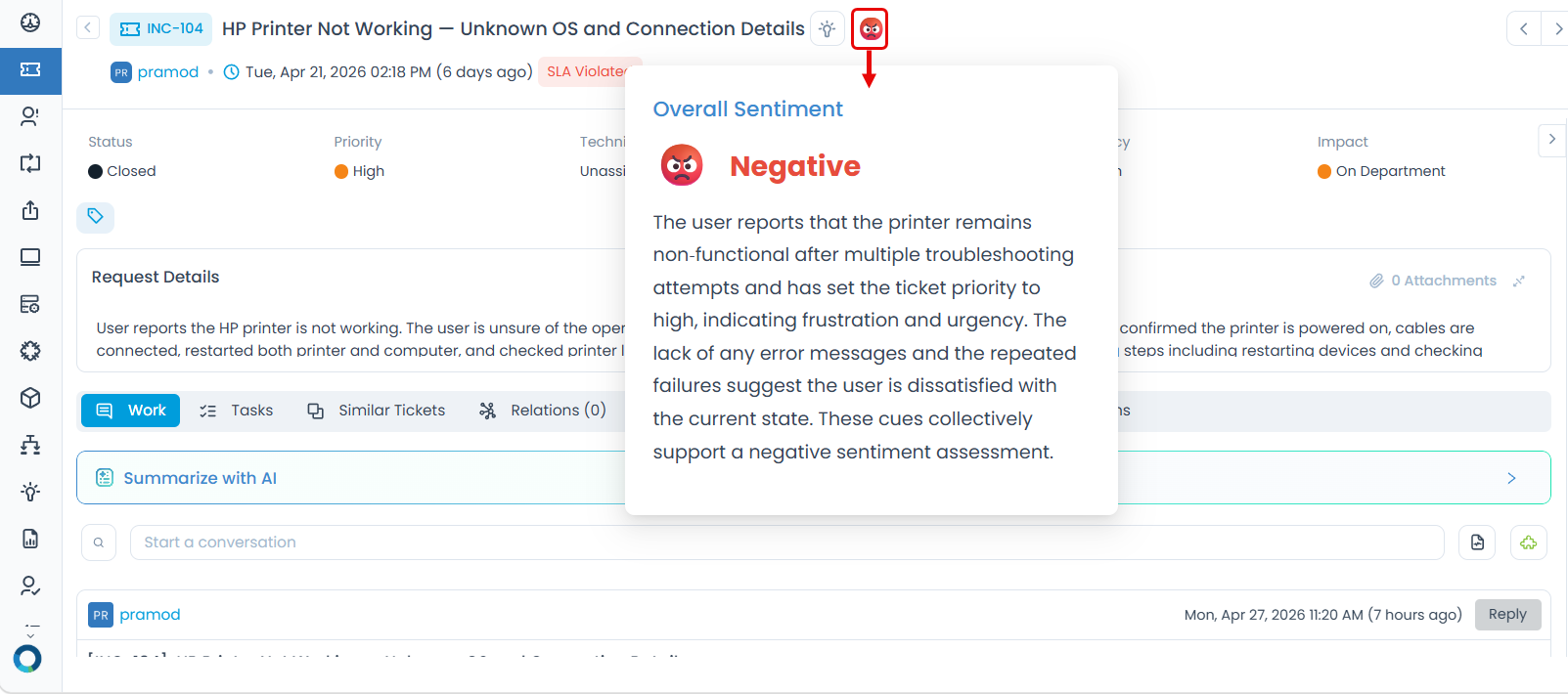Spotting Escalation Risk Early: A ticket that started as Neutral turns Negative after two failed resolution attempts. The sentiment shift alerts the technician to escalate before the user contacts management directly.