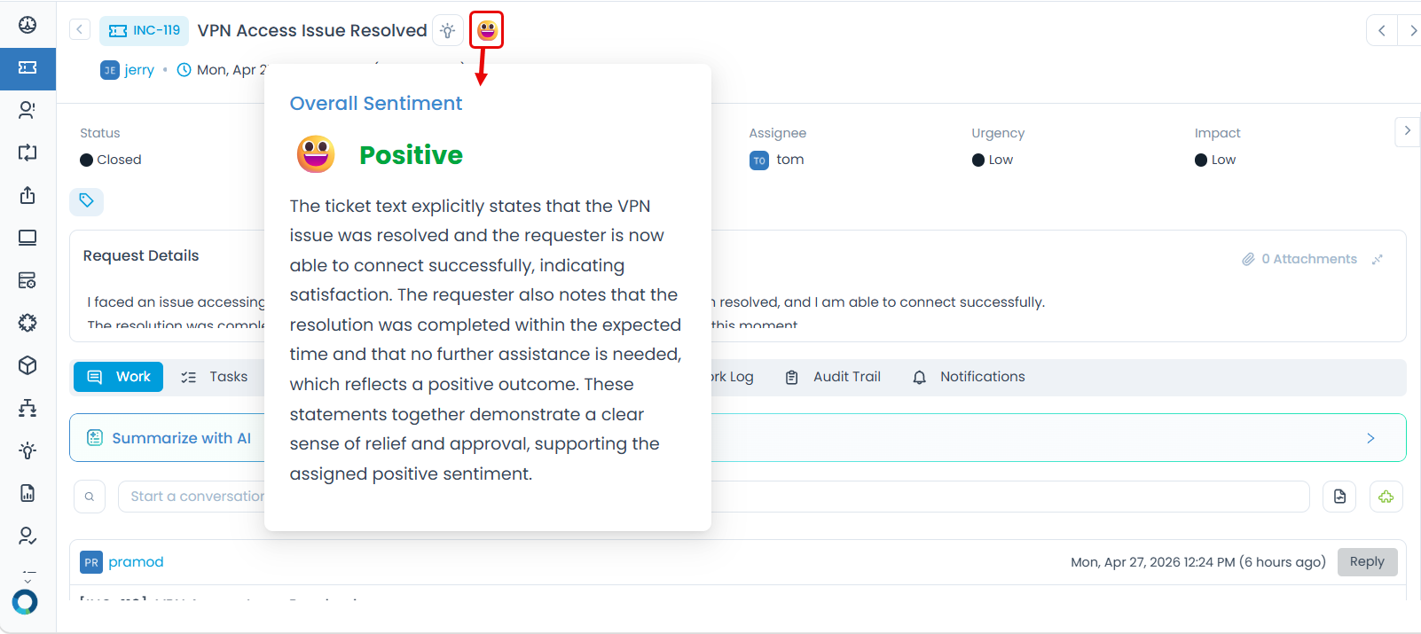 A request such as "VPN Access Issue Resolved" reflects satisfaction and is classified as Positive.