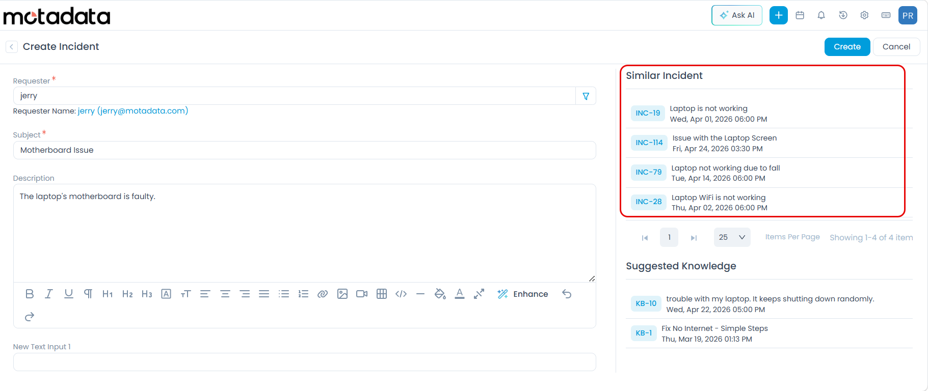 Example: Typing "Motherboard Issue" as the subject immediately displays INC-19, INC-114, INC-79, and INC-28 in the Similar Incident panel, along with related knowledge base articles (KB-1 and KB-10) in the Suggested Knowledge section below. This happens before the new record is saved.