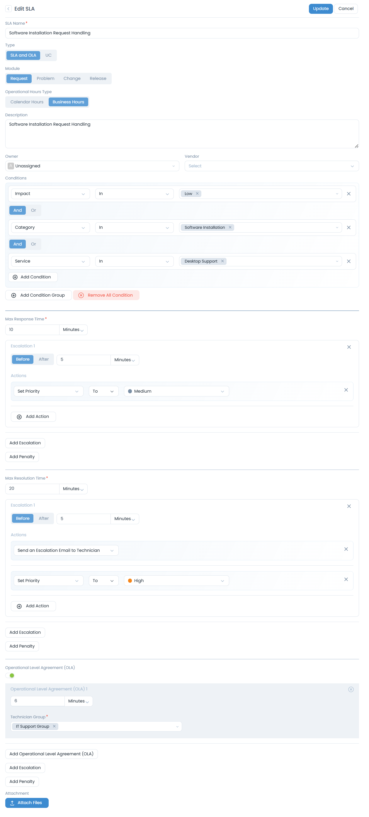 Operational Level Agreement (OLA) for Software Packaging: An OLA, set to 6 minutes, is introduced for the IT Support Group (assigned as the Technician Group) to manage their internal commitment for preparing the software package. When this OLA is applied (e.g., on Nov 28, 2025 12:32 PM), its due date is established for 6 minutes later, i.e., Nov 28, 2025 12:38 PM.