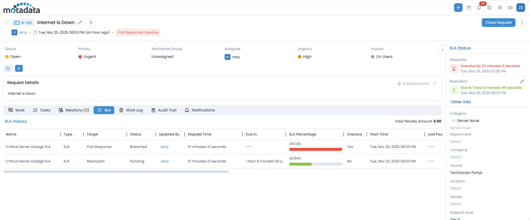 - SLA Name: Critical Server Outage SLA