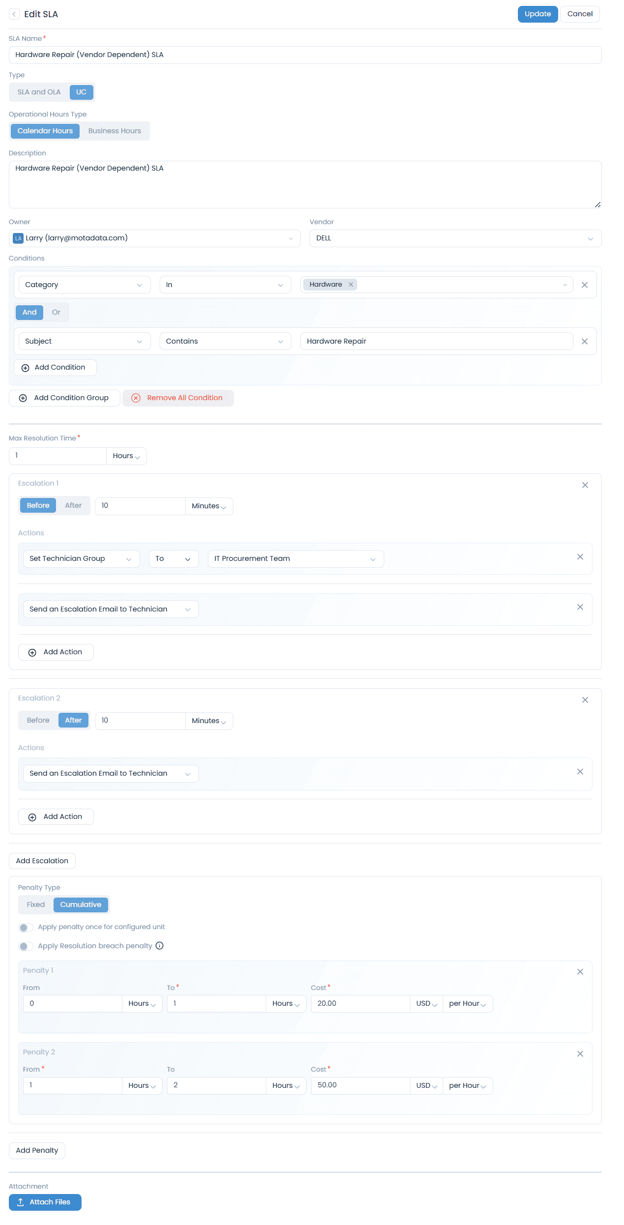 - Escalation 1 triggers 10 minutes before the resolution due date, setting the technician group to "IT Procurement Team" and sending an escalation email to the technician, allowing proactive follow-up with the vendor.