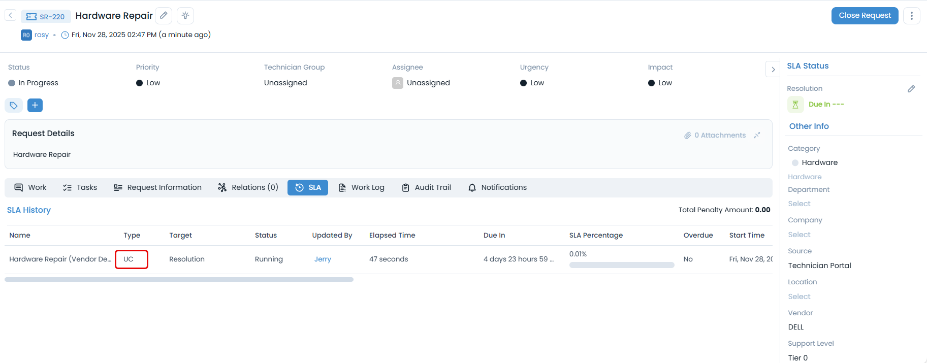 - Description: This SLA is designed for hardware repair requests, ensuring timely vendor engagement and resolution with escalations and penalties.