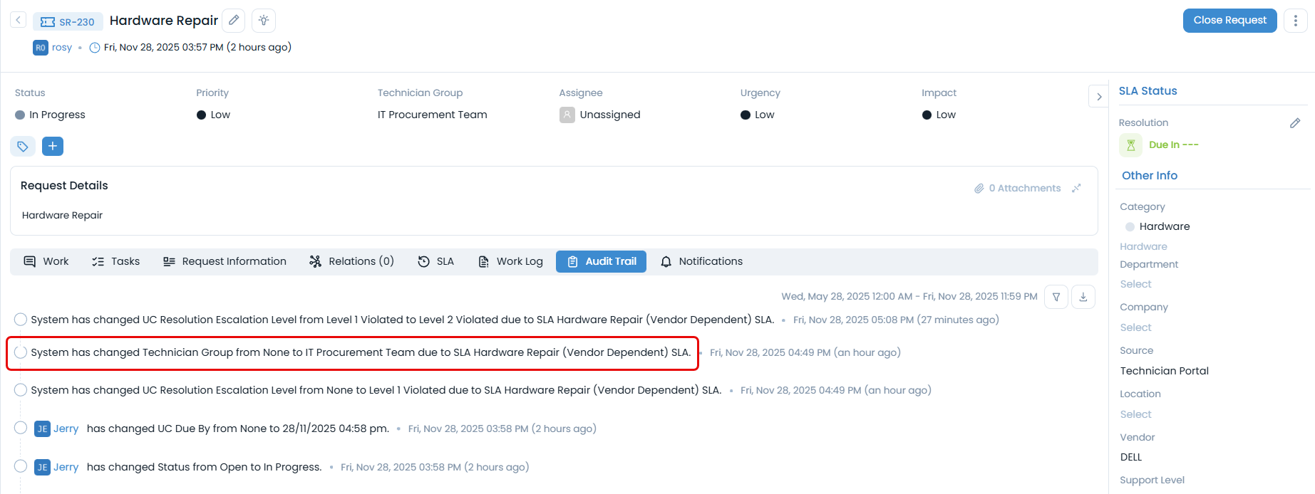 Also, you can view the Audit Trail for the request to see the SLA details as shown below.