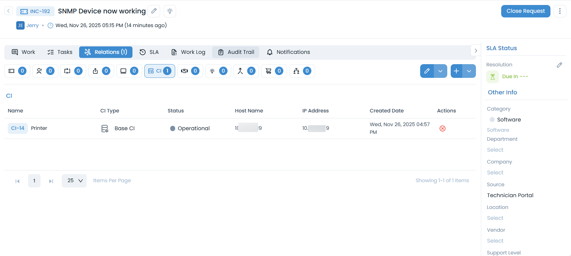 - Check the Relations tab of the incident to confirm that a CI has been automatically linked.