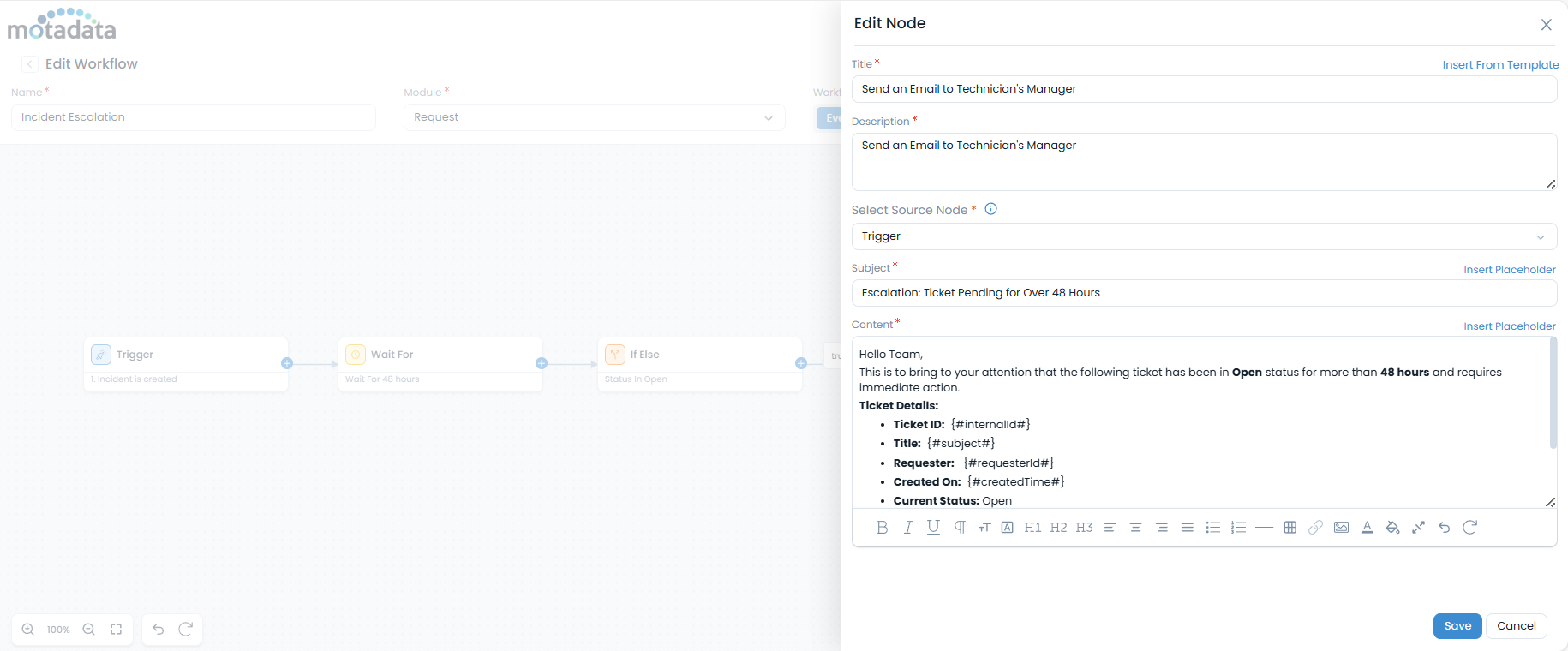 How it Works: When a new incident is created, the workflow starts and immediately encounters the Wait For node, pausing for 48 calendar hours. After the delay, the If/Else node checks the incident's current status. If the status is still 'Open', an escalation email is sent to the manager. If the status has changed, the workflow would follow a different path.