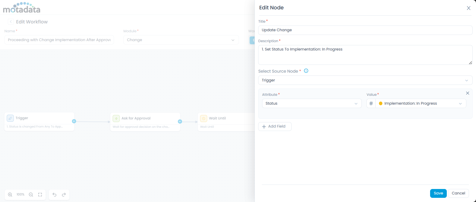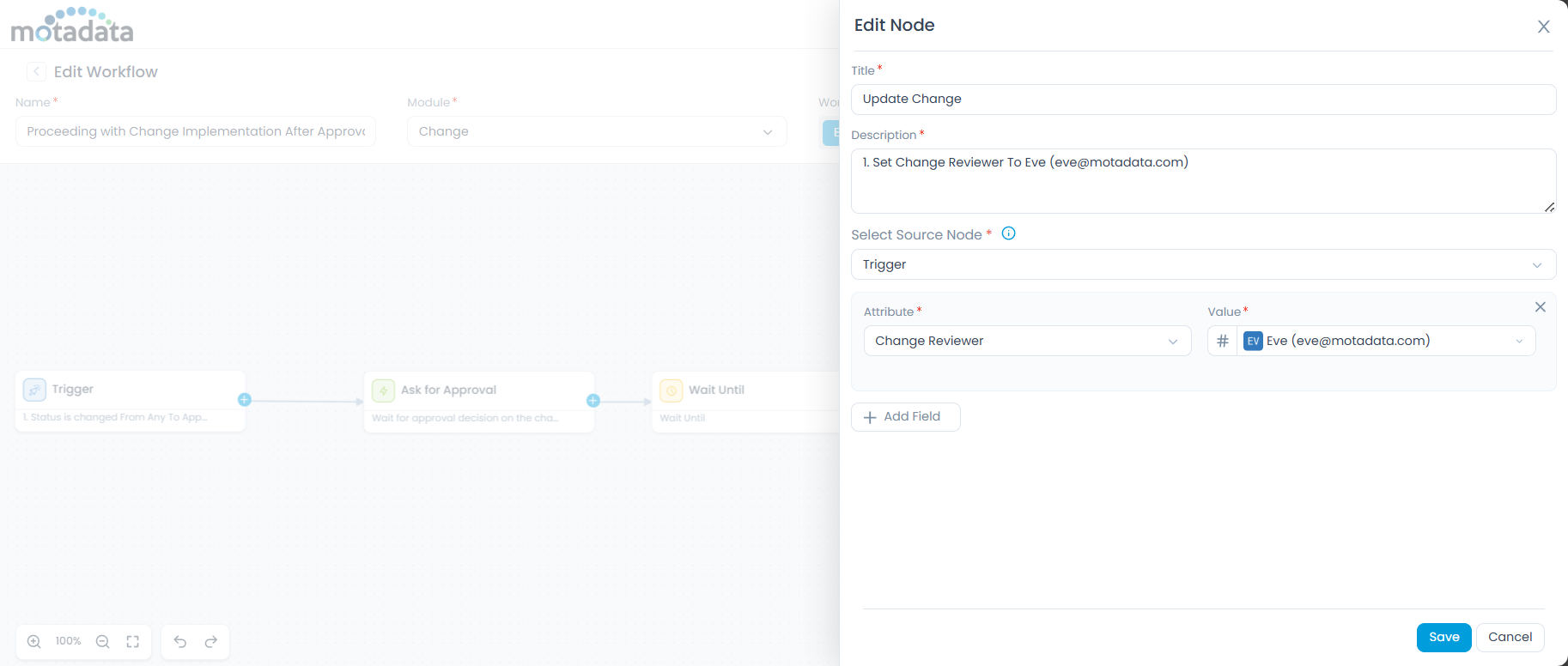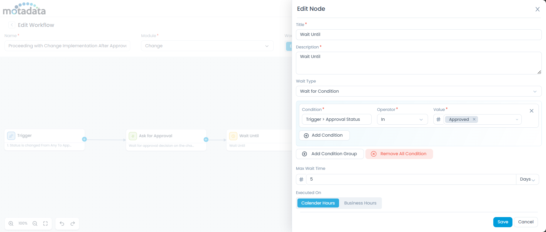 When a change request moves to Approval Pending, the workflow is automatically triggered and sends an approval request using the Ask for Approval node. The workflow then pauses at the Wait Until (Condition) node and continuously evaluates the approval status.