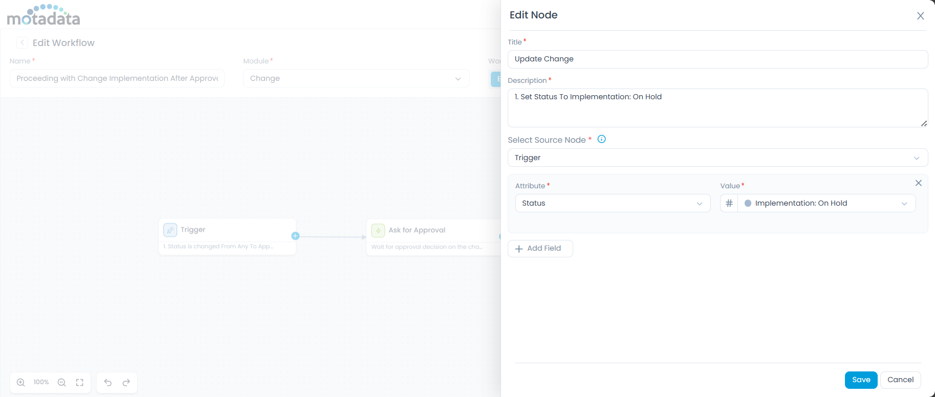 Timeout Path Action (Approval Not Received): Update Change → Set Status to Implementation On Hold.
